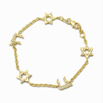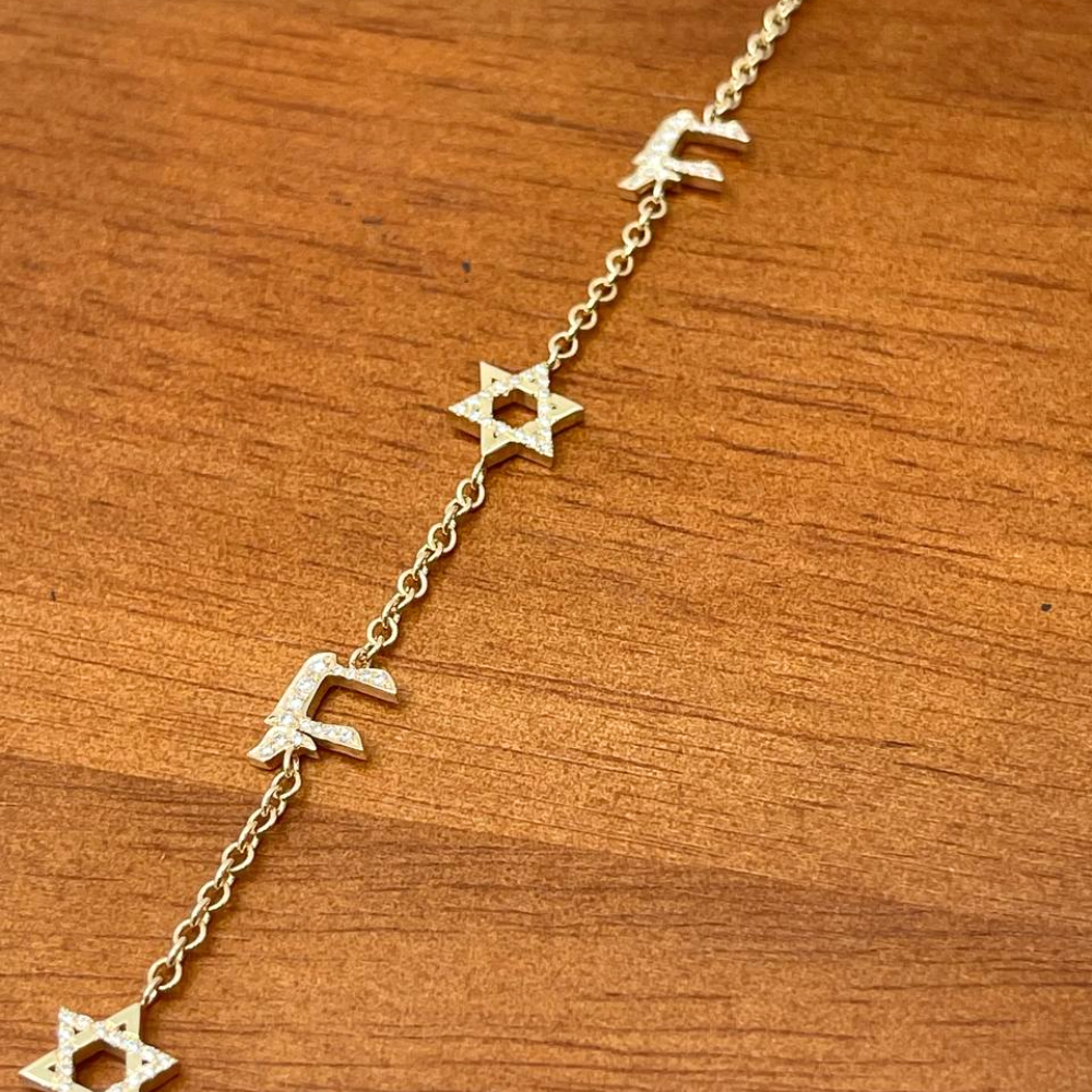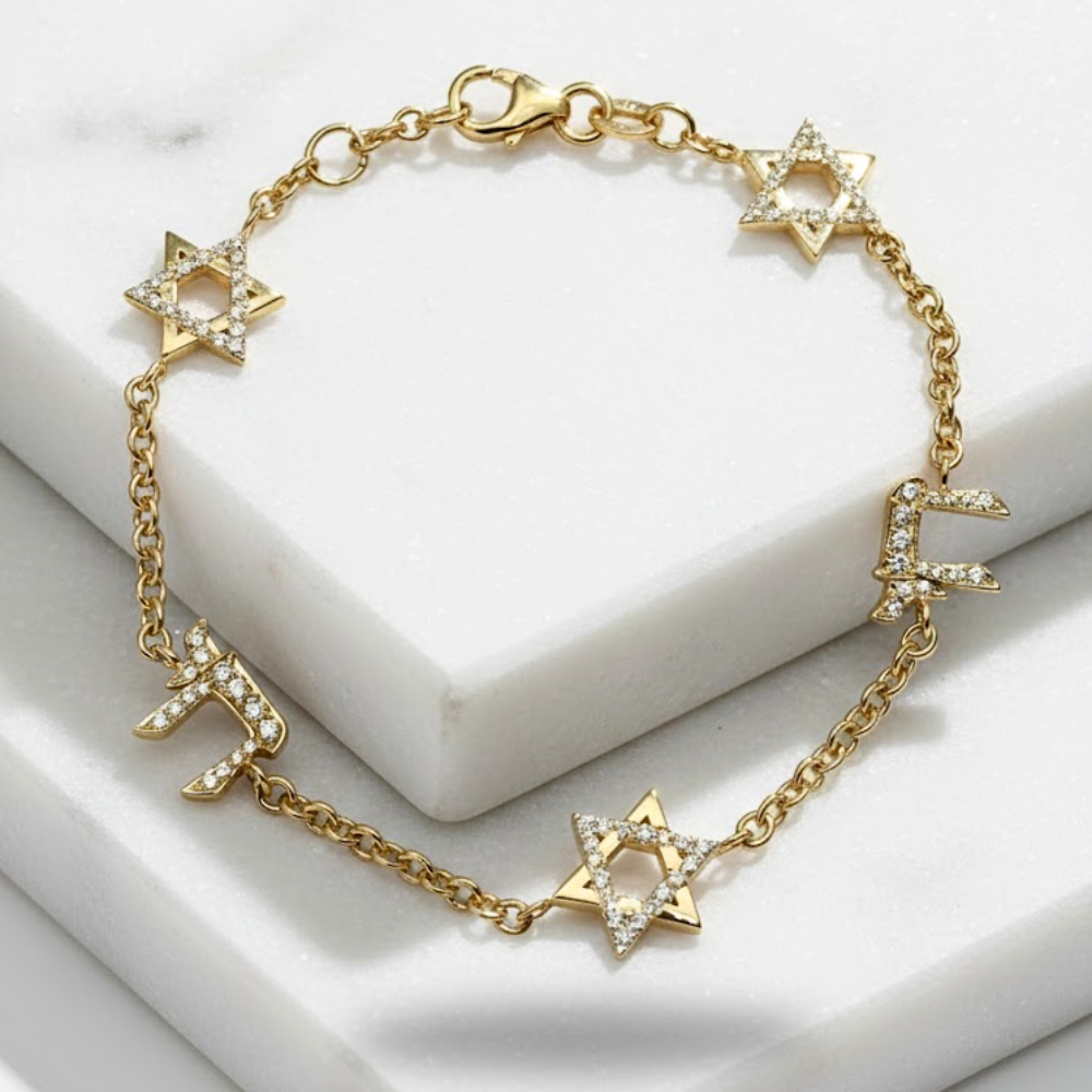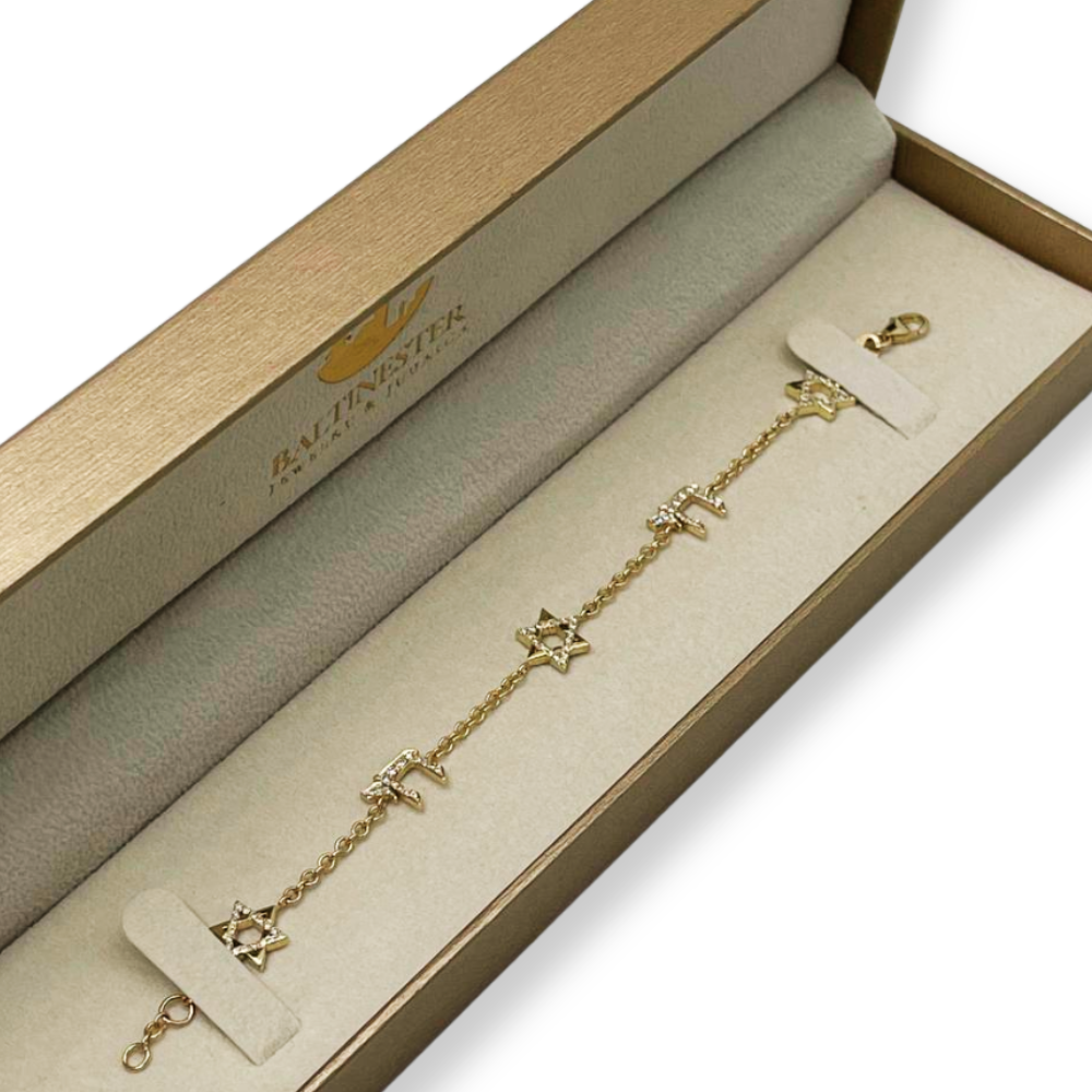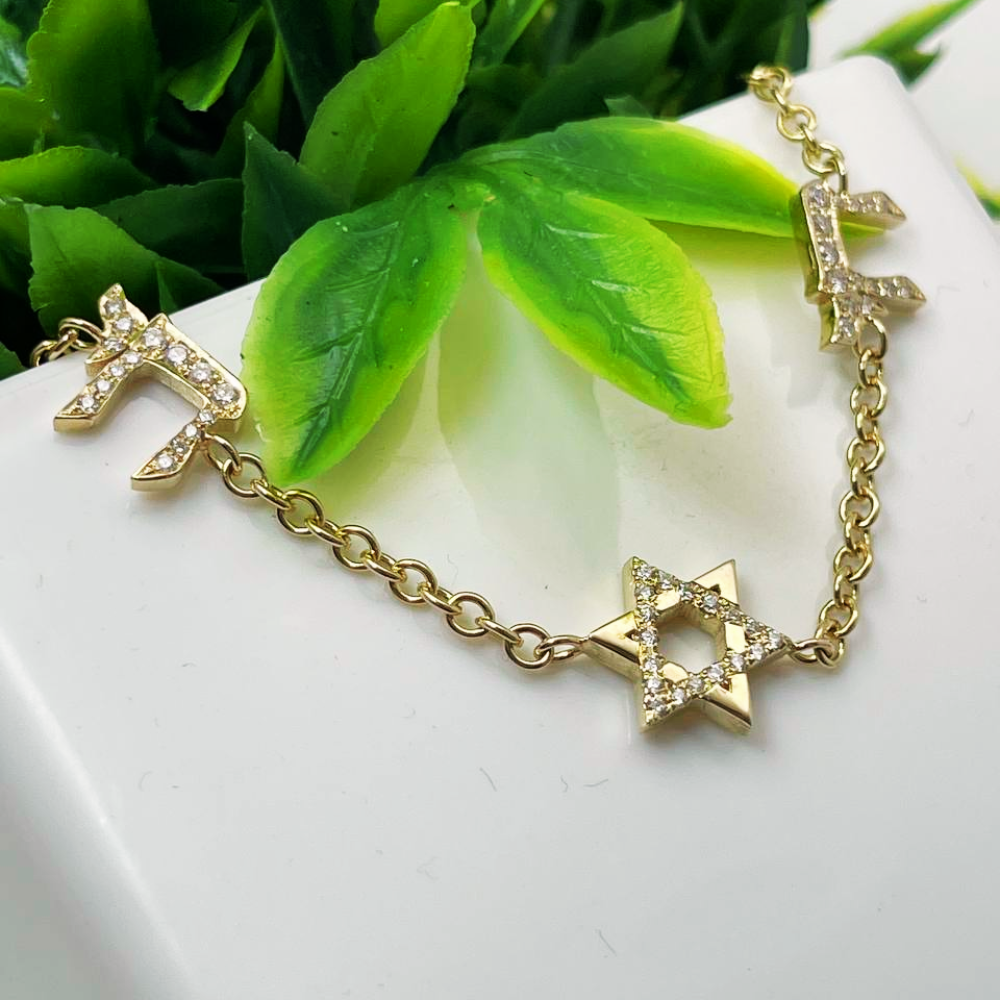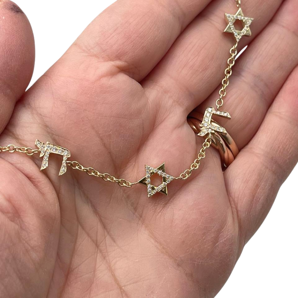 This exquisite 14K gold and diamond charm bracelet brings together two timeless Jewish symbols — the Star of David and Chai — in a refined design made for modern wear. Set with 0.5 carats of natural diamonds, each charm catches the light with understated brilliance while carrying deep spiritual meaning.
