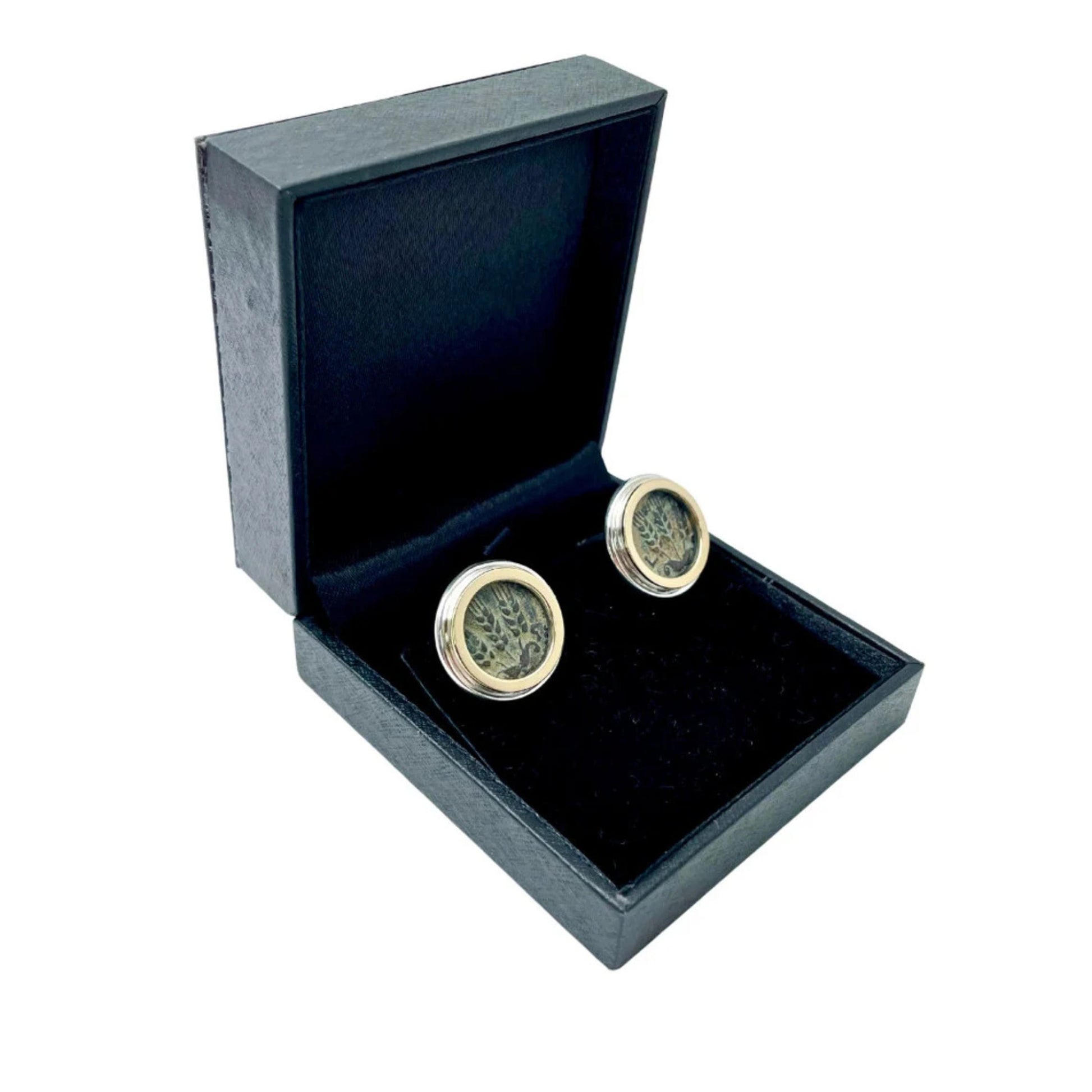 A round pair of cufflinks handcrafted from sterling silver with an ancient King Agrippa coin embedded in each. 14k yellow gold frames the coins, for an added drop of elegance.