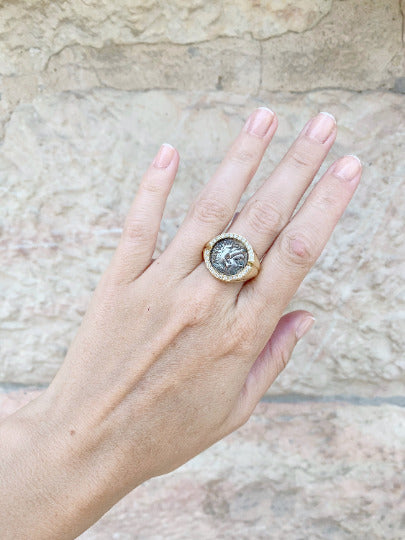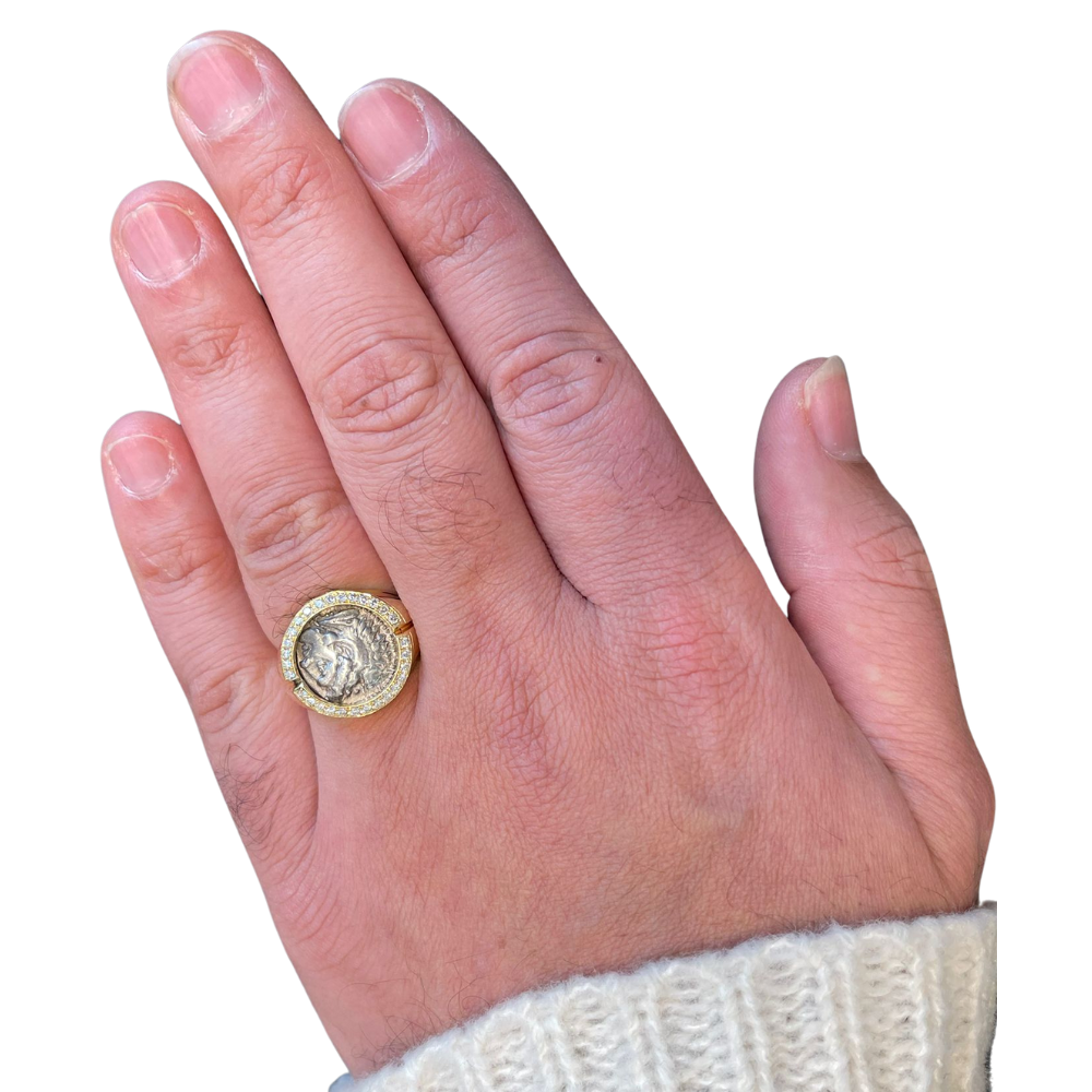 Melded on 14k gold, this ancient coin sits royally surrounded by dazzling diamonds. Dating back to circa 325-323 BCE, this Alexander the Great coin is in a rare pristine condition. Handcrafted in pure gold, the signet ring exudes power and luxury.