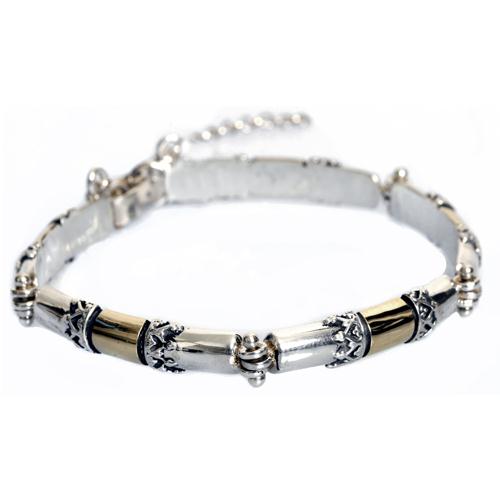 Exquisitely designed sterling silver and 14k gold sections are linked together to create this stunning handmade bracelet.