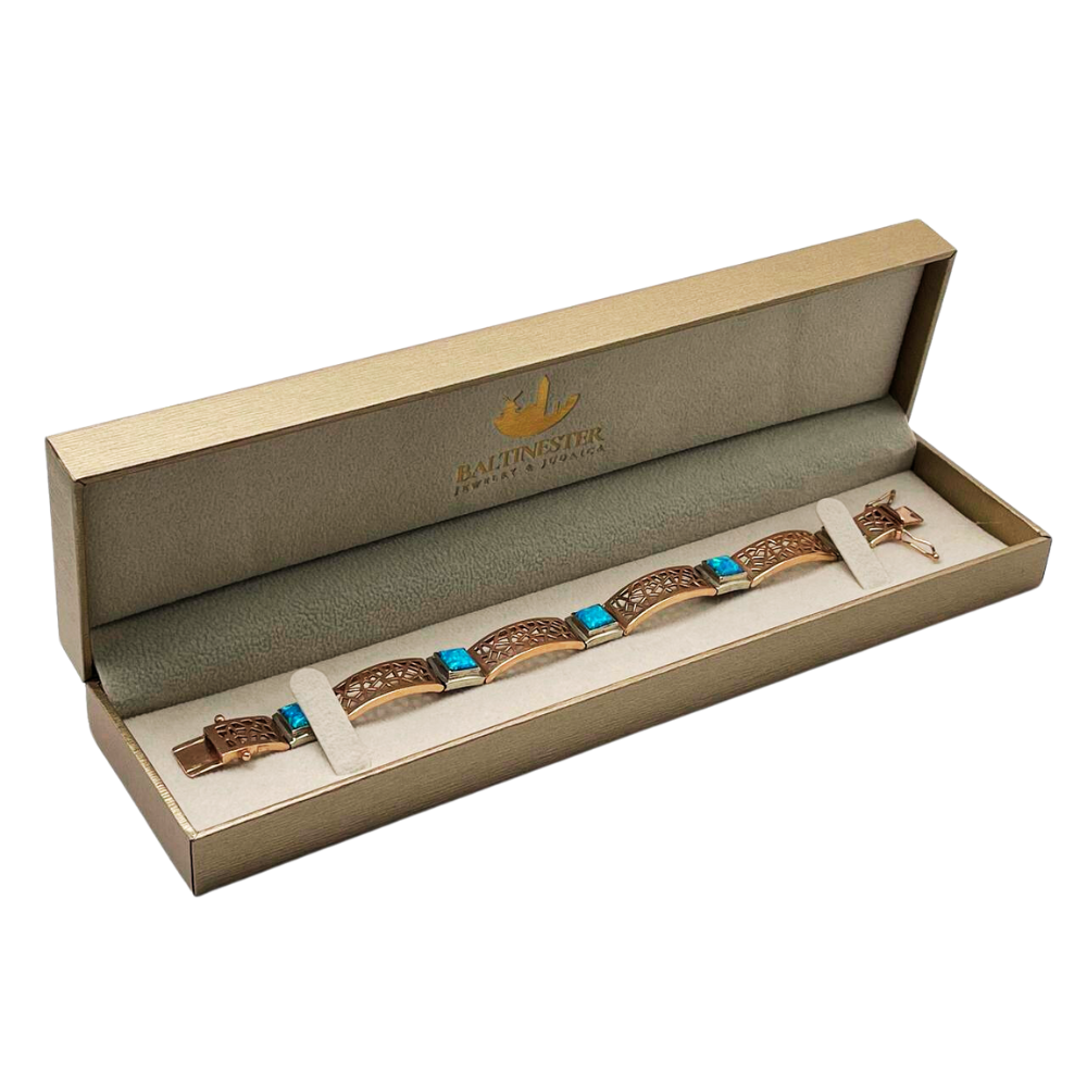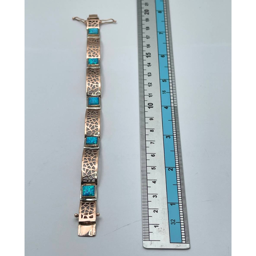 This beautiful eye-catching bracelet is comprised of 14k rose gold carved into a shattered glass design and linked with square turquoise-colored opals embedded into 14k white gold. An absolutely stunning piece perfect for any look.