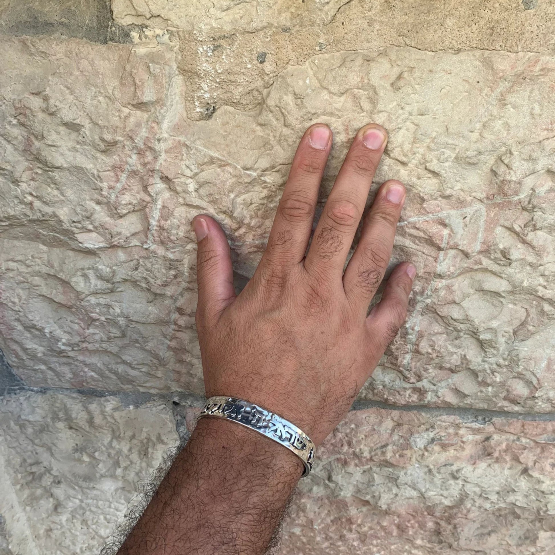 This trendy cuff bracelet fully handcrafted in hammered sterling silver is embossed with the Shema Yisrael prayer in beautiful Hebrew lettering. It reads: “Shema Yisrael Hashem Elokeinu Hashem Echad” (which translates to - Hear O Israel the L-rd is Our G-d the L-rd is One) - Deuteronomy 6:4 The bracelet is an open-ended one which makes it a one-size-fits-all creation.