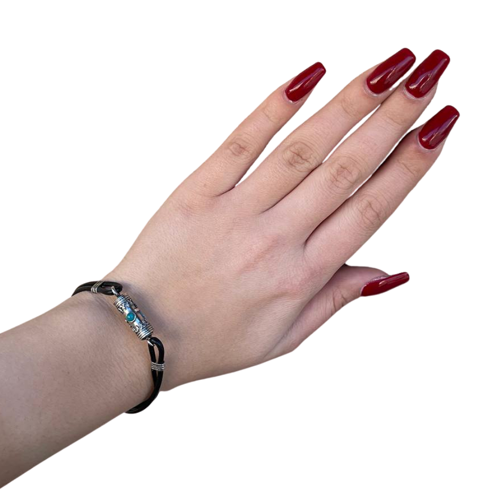 A trendy religious sprayer bracelet in silver and leather. A thin band of authentic black leather holds this bracelet together. The band features two strings and a silver cylindrical charm with Hebrew characters "alef," "lamed," and "daled" soldered on to it, lending it a very vintage feel. Combining these letters is said to invoke particular protective blessings. A small turquoise stone fitted in the center of the piece offers you more color and flair as the black and silver blend beautifully with the rich hues of the turquoise. The centerpiece contains a microfilm copy of the Hebrew Book of Psalms.