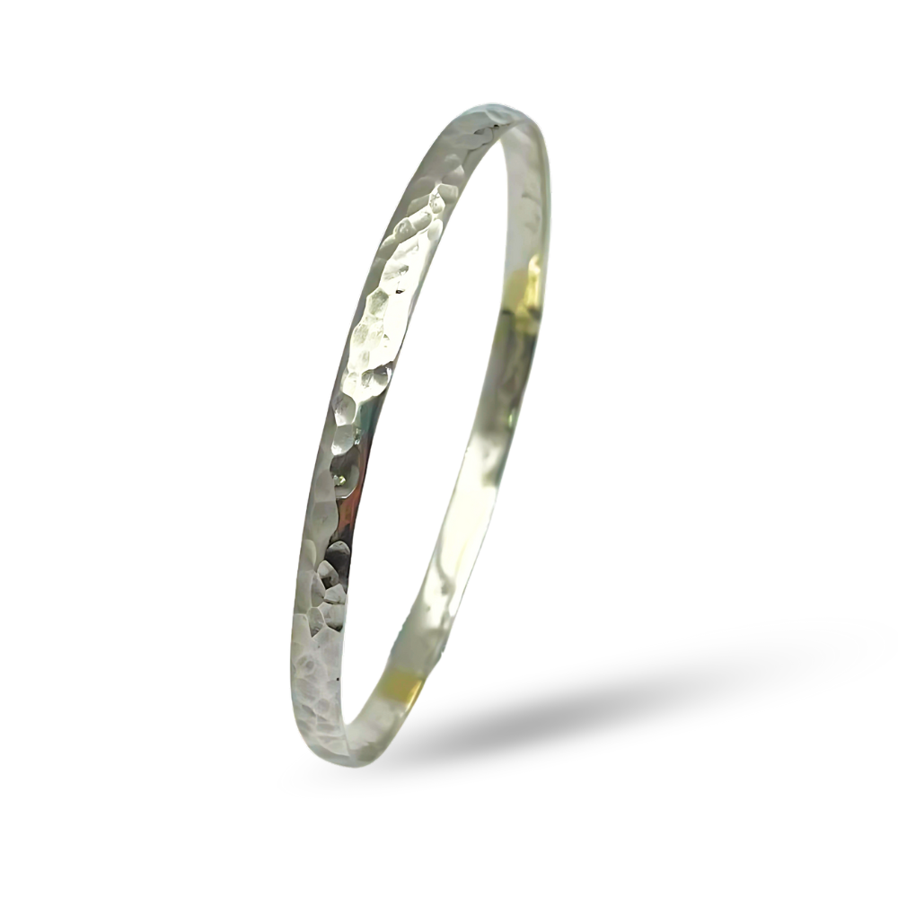 Discover the allure of this handcrafted silver stacking bangle, a unique piece inspired by the vibrant culture of Morocco. This exquisite bangle features a captivating hammered texture that adds depth and dimension, creating a mesmerizing interplay of light and shadow. Designed for effortless wear, the slip-on style allows you to easily add it to your collection.