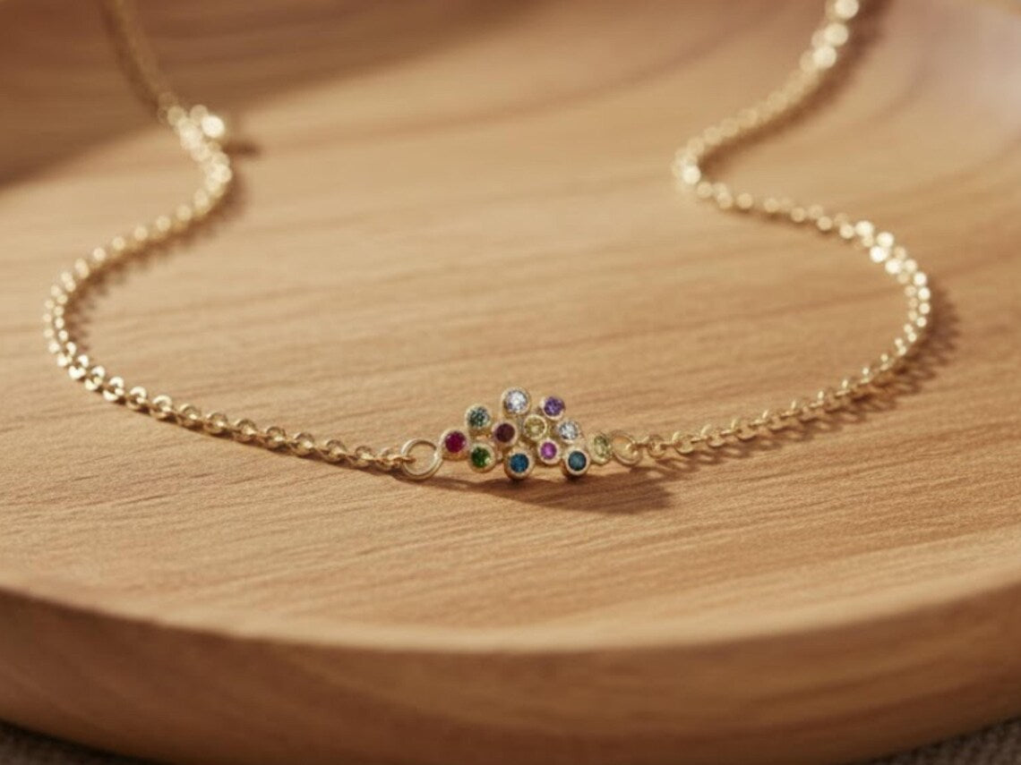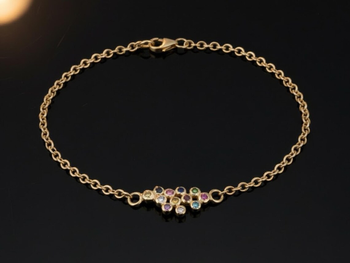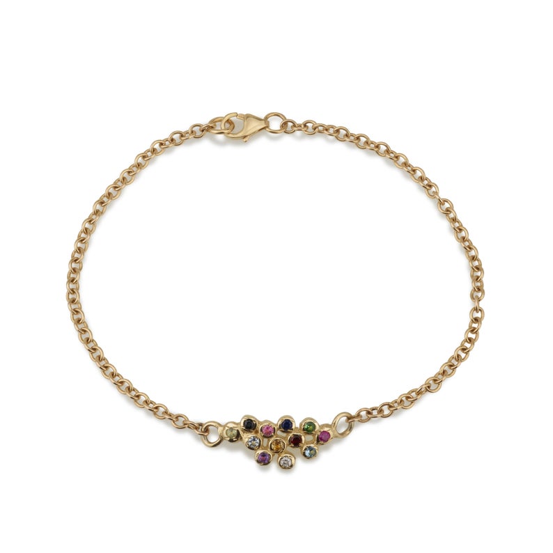A chic bracelet fully handcrafted in 14K gold, this features the 12 colorful Hoshen gems, each set separately as globules and then joined. The length of the bracelet is created with a slim chain pattern. It can be fastened with a firm lobster clasp at the back.