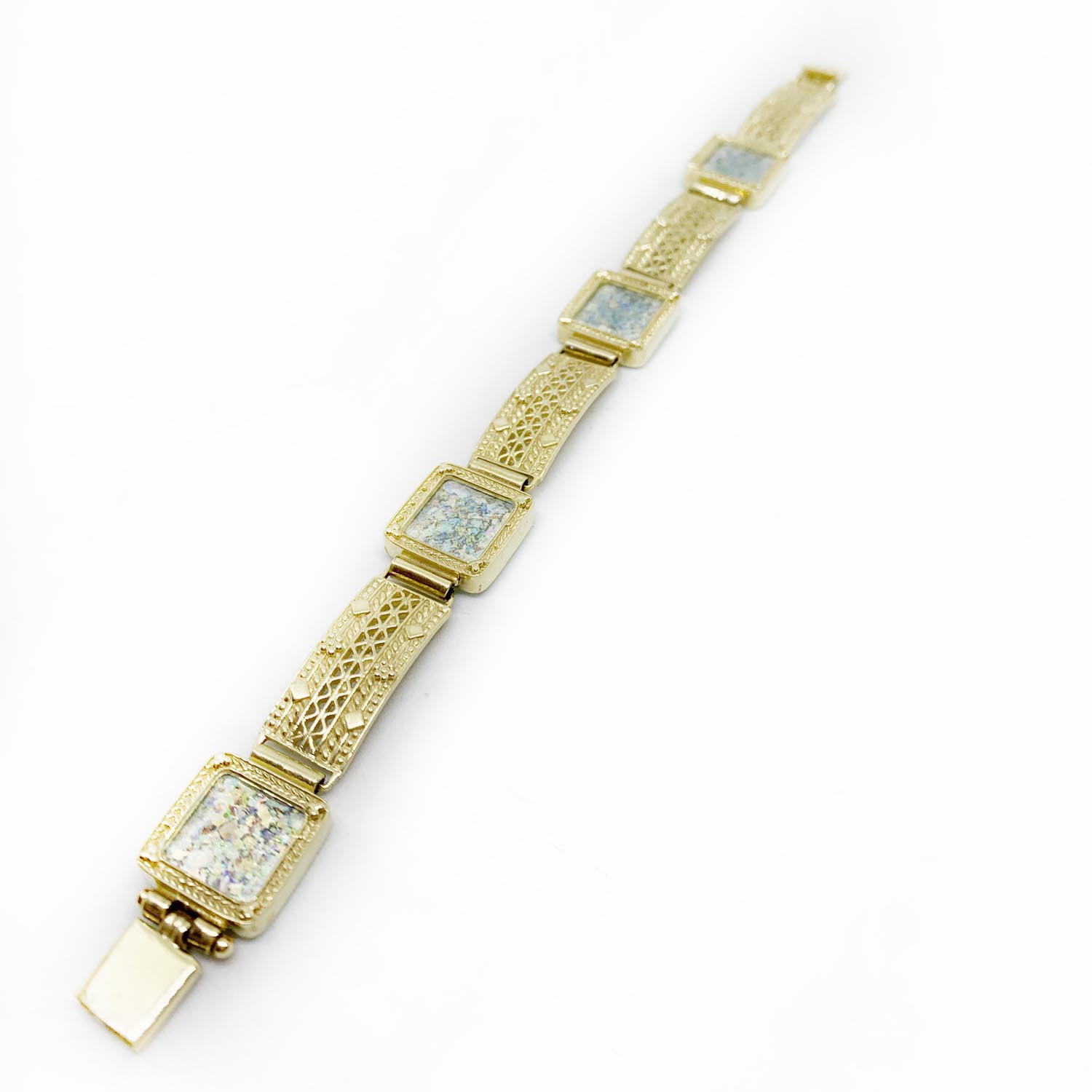Square Roman Glass Yemenite Filigree Style 14k Gold Bracelet