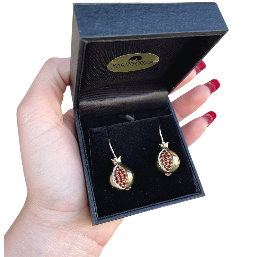 These unusual and striking earrings are hand formed using 14k gold to make a smooth-finish gold pomegranate set. What makes these earrings truly wonderful, however, is the placement of tiny red garnets resembling dozens of seeds. In Jewish tradition pomegranates are said to have exactly 613 seeds to symbolize the 613 mitzvot of the Torah, making this a truly meaningful pair of earrings.