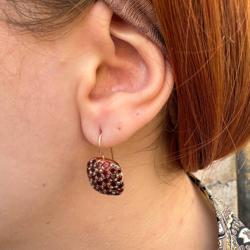 Crafted in Israel with meticulous attention to detail, these beauties showcase a mesmerizing square design, entirely pavé-set with vibrant garnets. The intricate pavé technique creates a dazzling blanket of gemstones, their fiery brilliance guaranteed to steal the show.