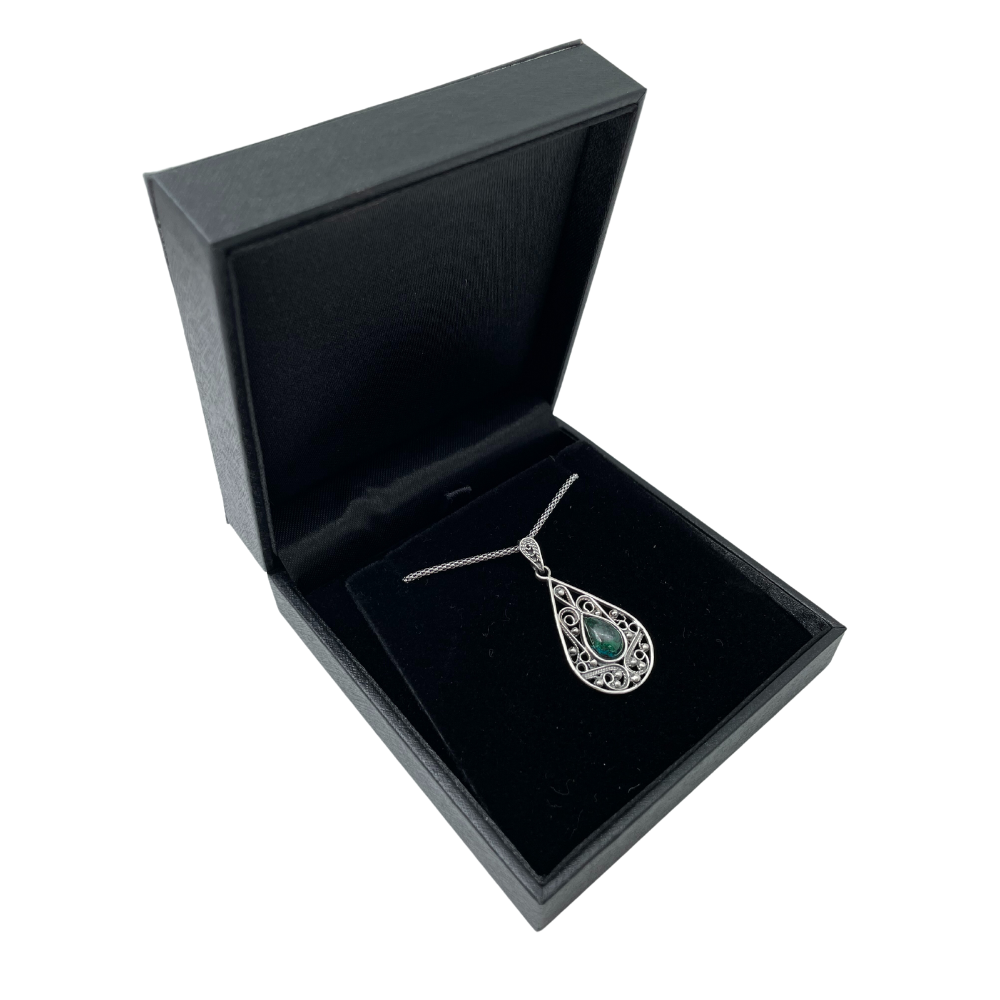 This Yemenite style pear-shaped pendant is made of sterling silver filigree and set with a Cabochon Eilat Stone. The precise metalwork is fully handmade. Braided swirls and beads surround the central stone.