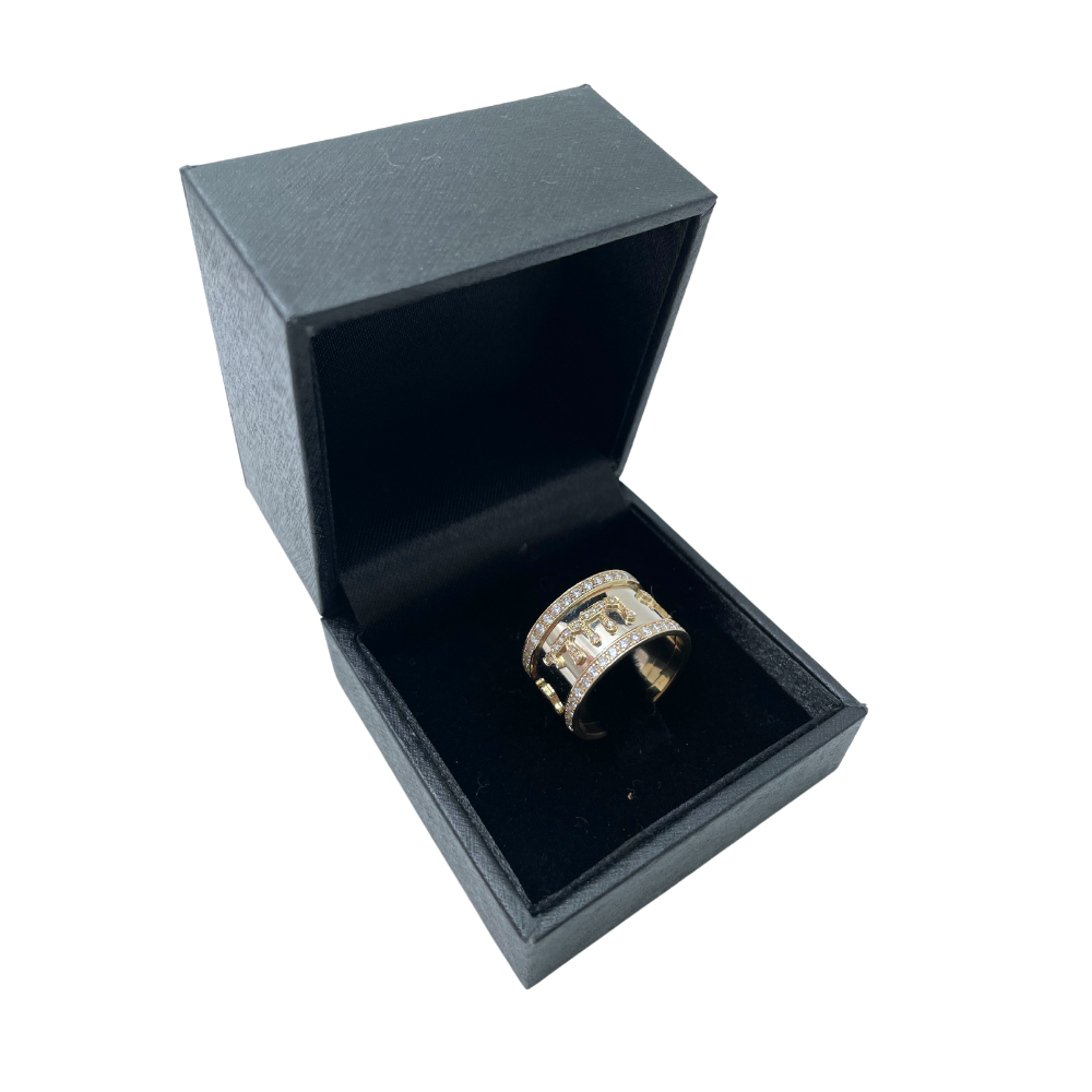 - Both the borders and letters are raised in 14k yellow gold, adding a beautiful color contrast.