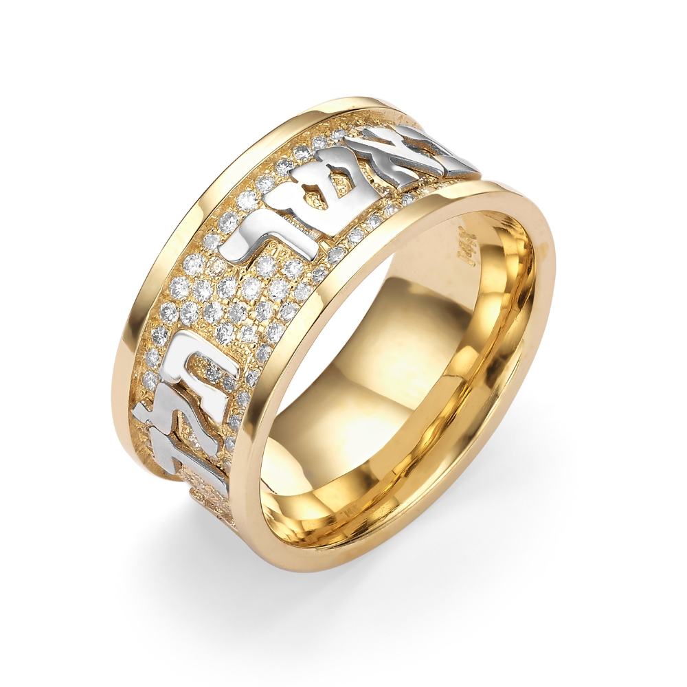 14K Gold Diamond Studded Wedding Ring with Hebrew Romantic Verse