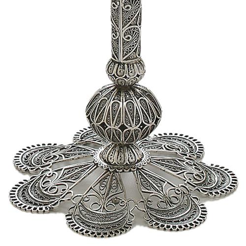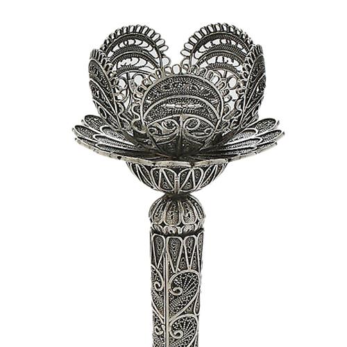 Large silver candlesticks with flower shaped cups and bases in filigree design.