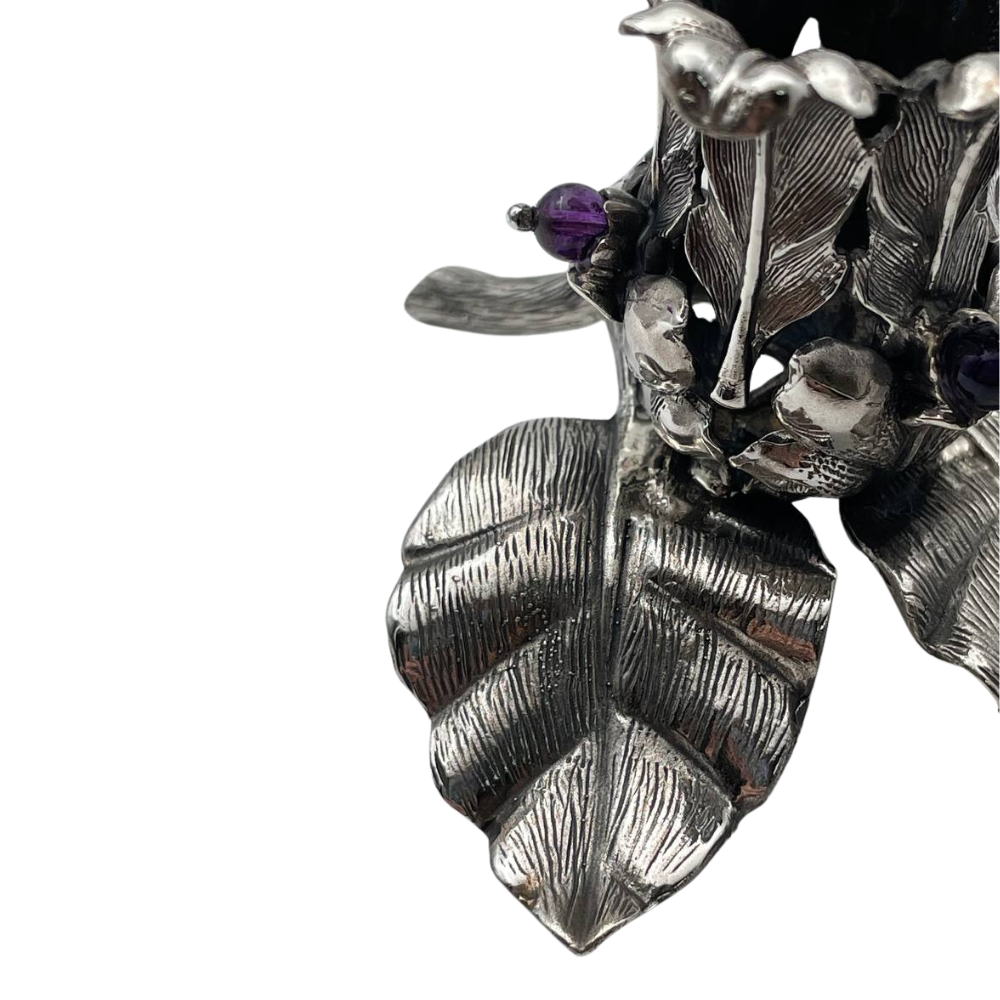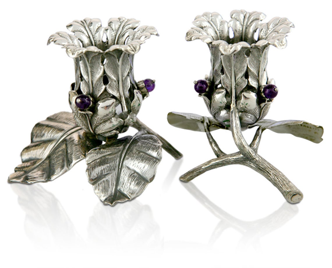 Inspired by Nature, these candlesticks are shaped like freshly-picked blossoming flowers. Complete with leaves and twigs handcrafted with a realistic touch, this set of candlesticks is sure to liven up a celebration table! Purple amethysts are used to add some color. The outdoorsy-vibe is unmissable!