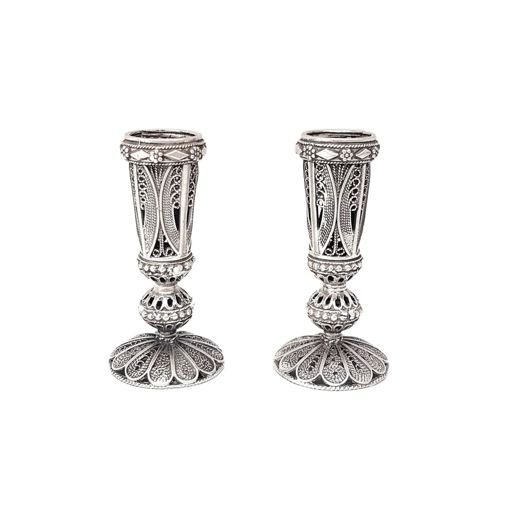 These breathtakingly gorgeous candlesticks are handcrafted in Israel by experienced Yemenite artisans. The ancient art of filigree is brought to life with intricate detailing in swirls and whorls, unique to the art form.