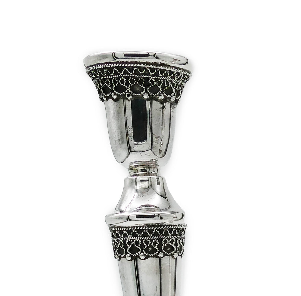 A marvelous set of handcrafted candlesticks, this is created in pure 925 Sterling silver by expert Jewish artisans. The Yemenite art of gorgeous filigree work is brought to life here with intricate detailed designing. The round base rest on three raised legs.