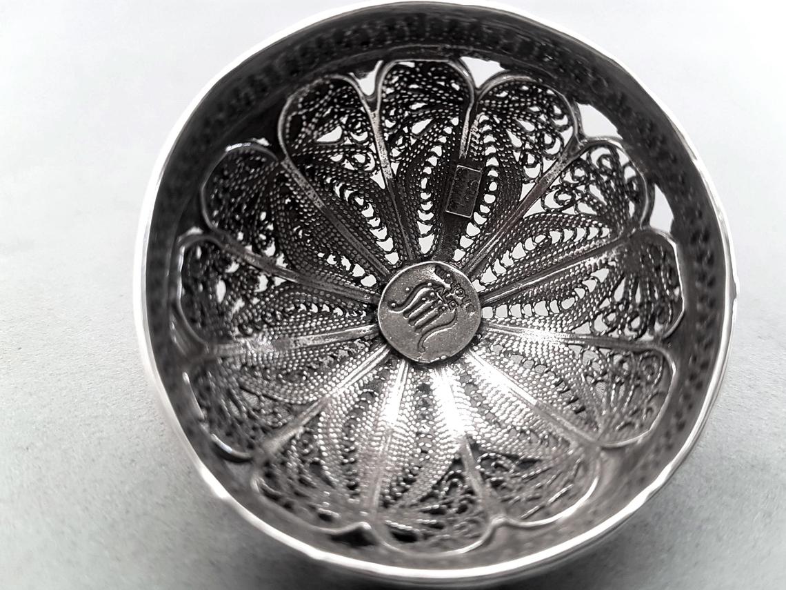 Created by Israeli artisans, this stunning Jewish spinning top or "dreidel", features intricate Yemenite filigree work. With an oxidized sterling silver look, this dreidel can double as a Besamim spice holder during Havdalah. The spindle of the dreidel is attached to a flower shaped cover engraved with four letters of the Hebrew alphabet nun, gimel, hey, peh (denoting the phrase 'Nes Gadol Hayah Po' – A Great Miracle Happened Here).