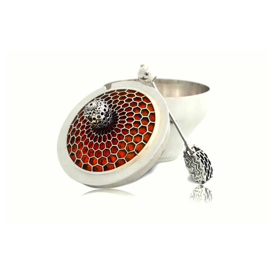Add color to your table with this vibrant honey dish set! Handcrafted in pure sterling silver, this set consists of a gleaming honey bowl with a lid patterned like a honeycomb. The deep 3D look is accentuated by red and orange enamel coloring. There is a handblown glass bowl insert to make sure its easy to clean and maintain. The dish is accompanied by a spoon with a matched beehive pattern as its ladle and a beautiful gleaming silver plate.