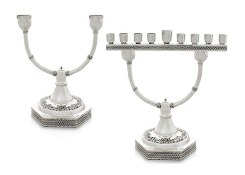 This two-in-one sterling silver Menorah Candelabra is made of 925 sterling silver with a smooth and clean finish. It is also decorated with delicate filigree, adding more beauty to the already stunning piece.
