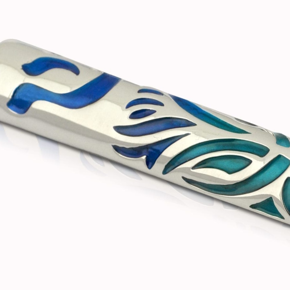 This exquisite Mezuzah Case is handcrafted in Sterling Silver with beautiful enamel detailing, a timeless and elegant piece. The Mezuzah is a cherished symbol in Jewish culture, signifying protection and blessings for the home. Our Sterling Silver Mezuzah Case offers a beautiful and meaningful way to fulfill this tradition, adding a touch of spiritual significance to your living space.
