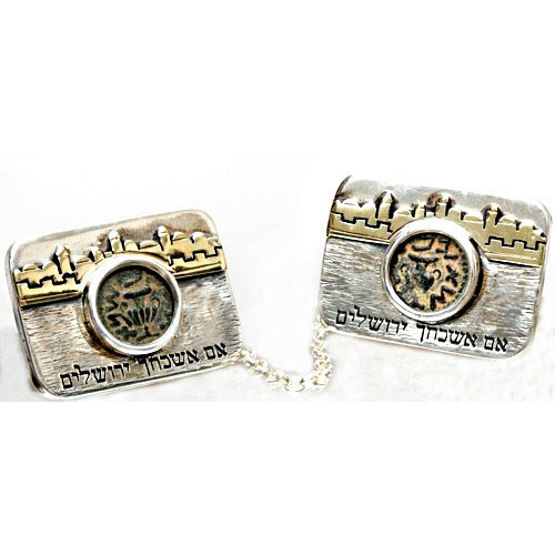 The clip integrates two great aspects of history in one: the Masada Coin dating back to the Great Revolt of the Jews against the Romans in the 1st century CE, and the holy city of Jerusalem. Engraved on this Tallit clip is King David's famous verse 'If I forget thee O Jerusalem'.