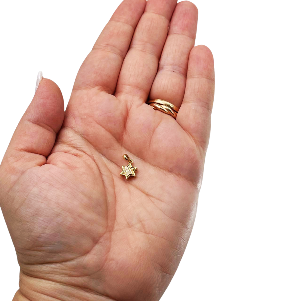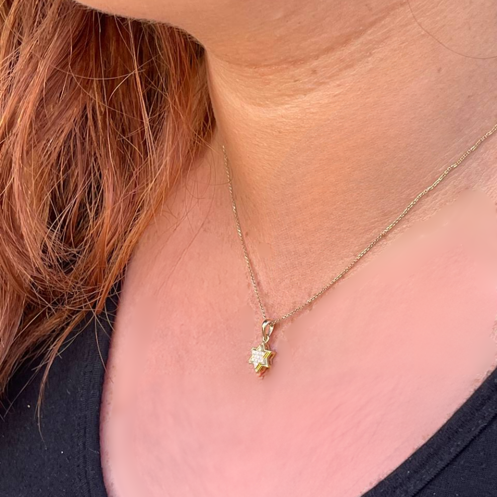 This shimmering mini Star of David pendant is a gorgeous piece of jewelry that will make a great gift. The upper layer is studded with several genuine diamonds, adding a dazzling effect to this already stunning pendant. The unique beauty and classic symbolism make this a great addition to our Star of David pendants collection.