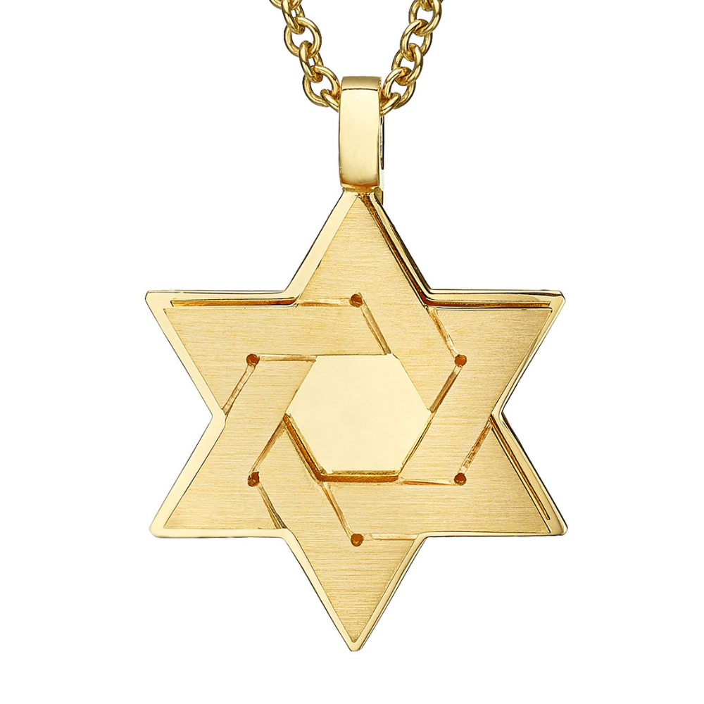 This gorgeous 18k Gold Dual Layered Brushed Star of David Pendant is a very special piece of jewelry that will make a great gift. The pendant is made of two layers. The bottom layer is a Star of David made of shiny yellow gold. The top layer is a cut out star made from yellow gold with a brushed finish. The bottom layer acts as a mirror, enhancing the upper layer's beauty. The combination of textures and the beautiful design make this a great addition to our Star of David Pendants collection.
