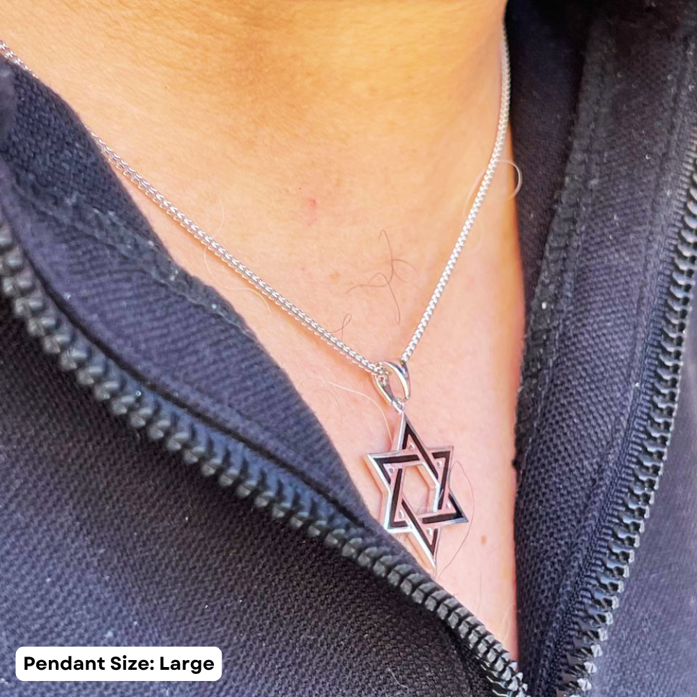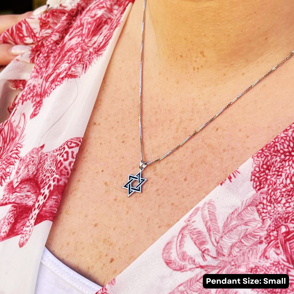 This 14K white gold Magen David pendant, featuring black enamel accents, is a handcrafted representation of a significant Jewish symbol. This pendant, available in three sizes, carries the historical significance of protection and tradition.
