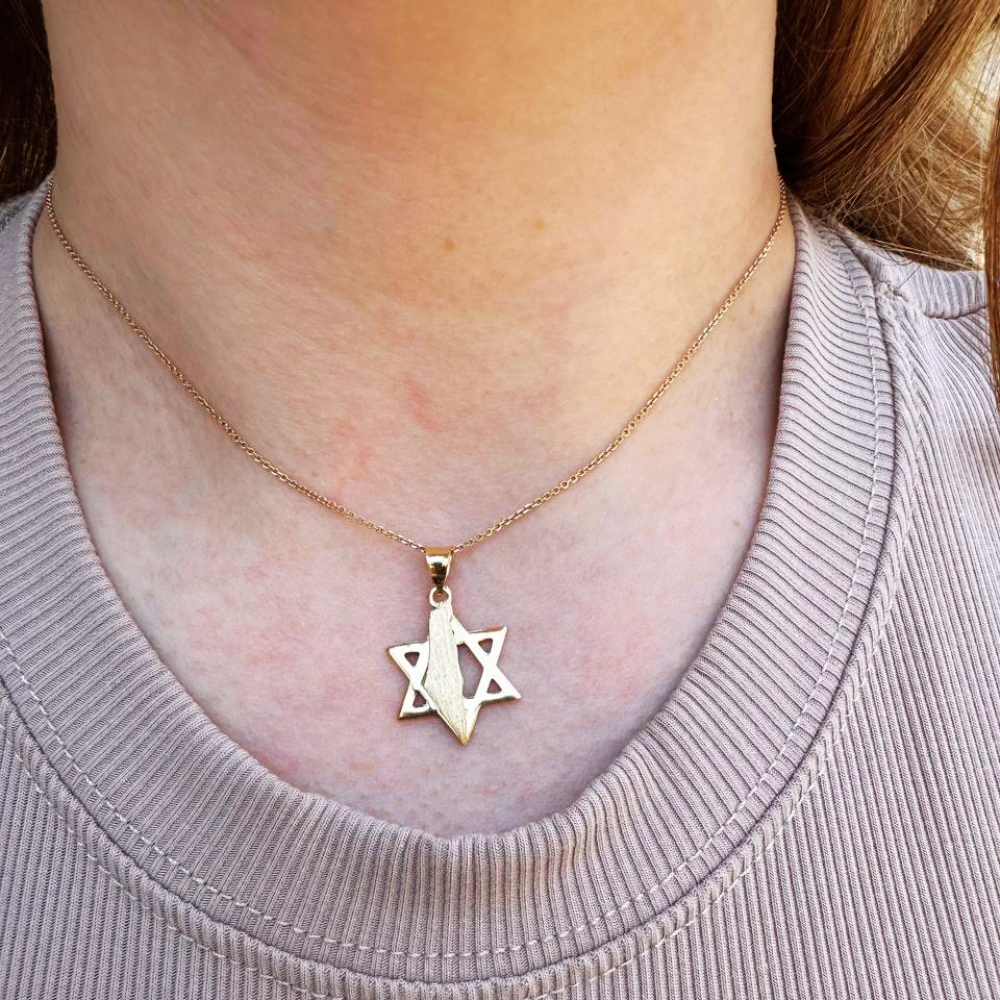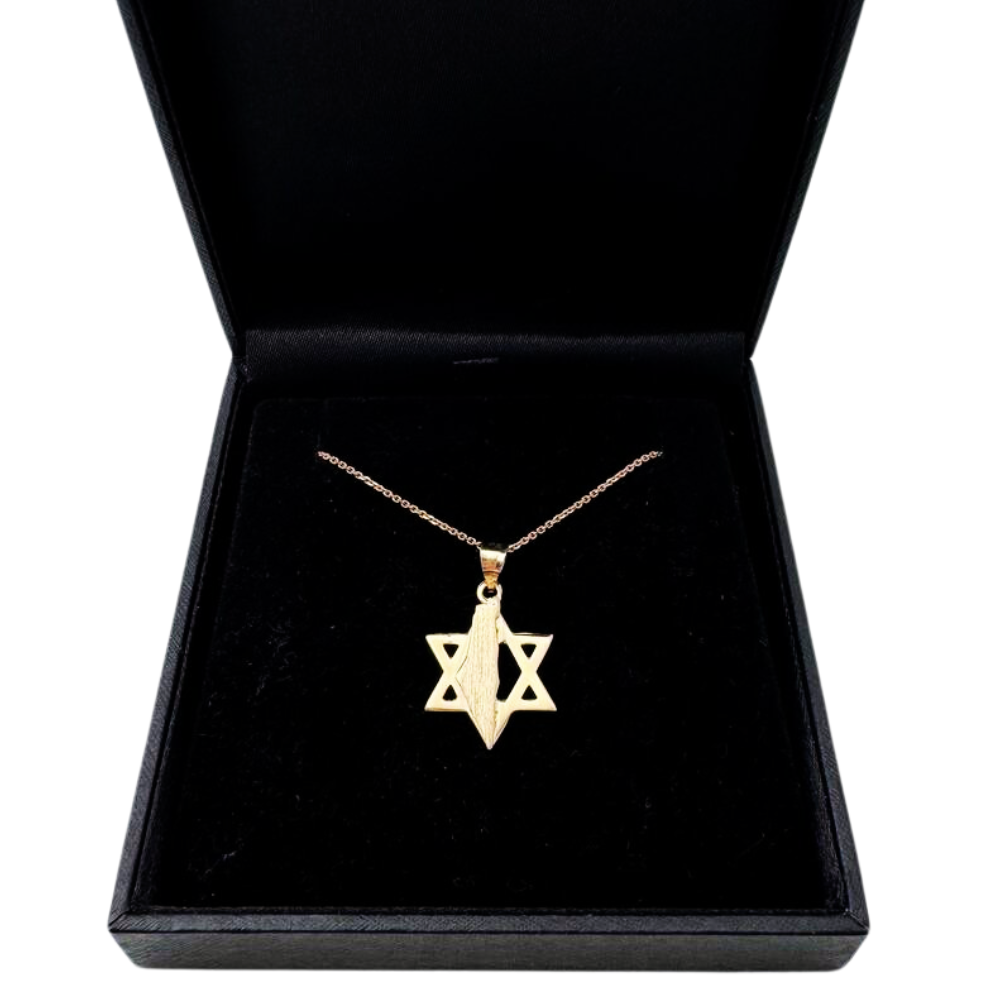 This exquisite Star of David with Map Pendant, handcrafted in 14K gold by skilled Israeli artisans, is a powerful statement of faith and solidarity. The magen David, a cherished symbol of Judaism for centuries, is the prominently shape of the pendant. It represents the interconnectedness of God, creation, and humanity, reminding you of your place within the divine plan. Nestled within the Star of David lies the map of Israel, the Holy Land.