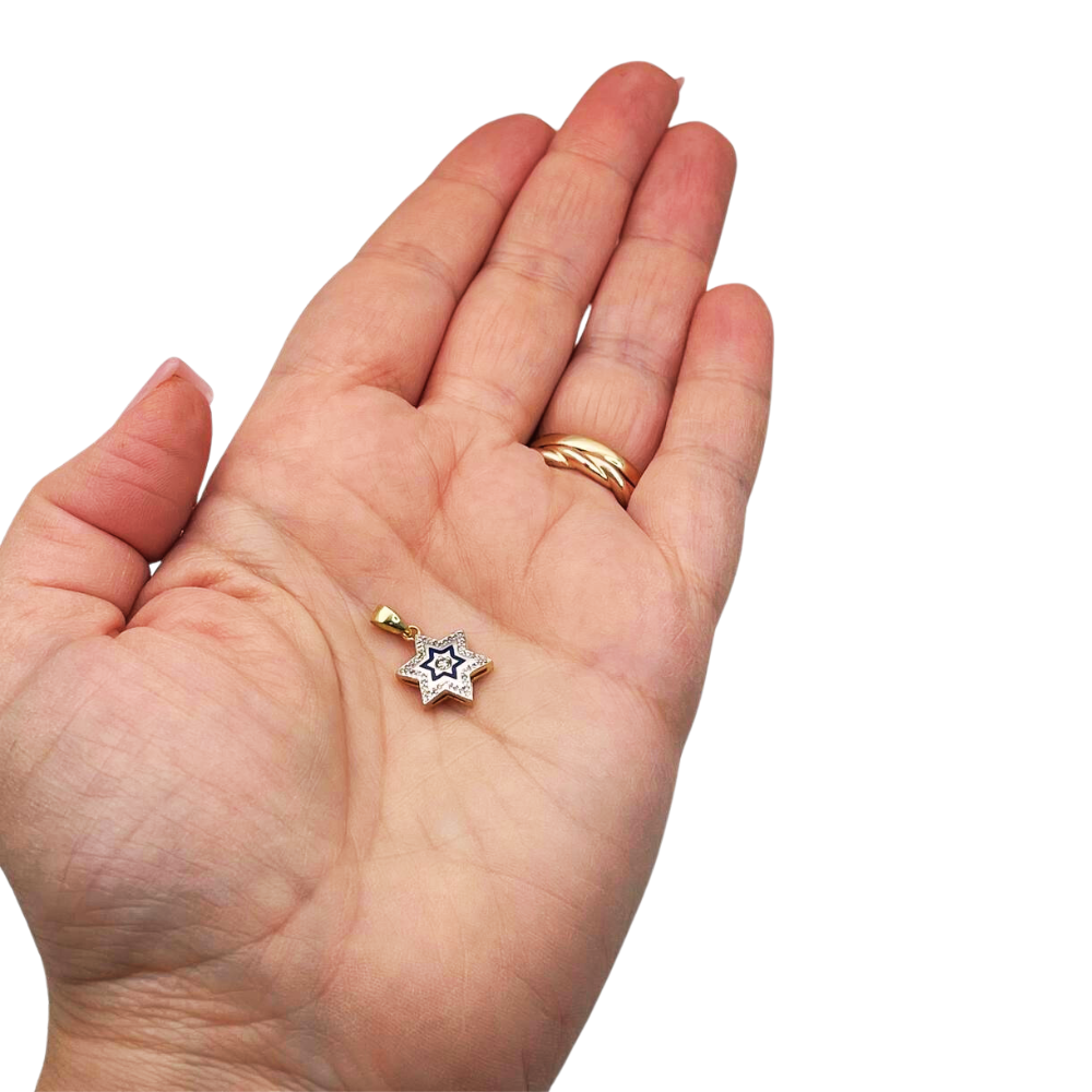 Diamond Star of David Pendant in 14K Yellow & White Gold with Blue Enamel - Small