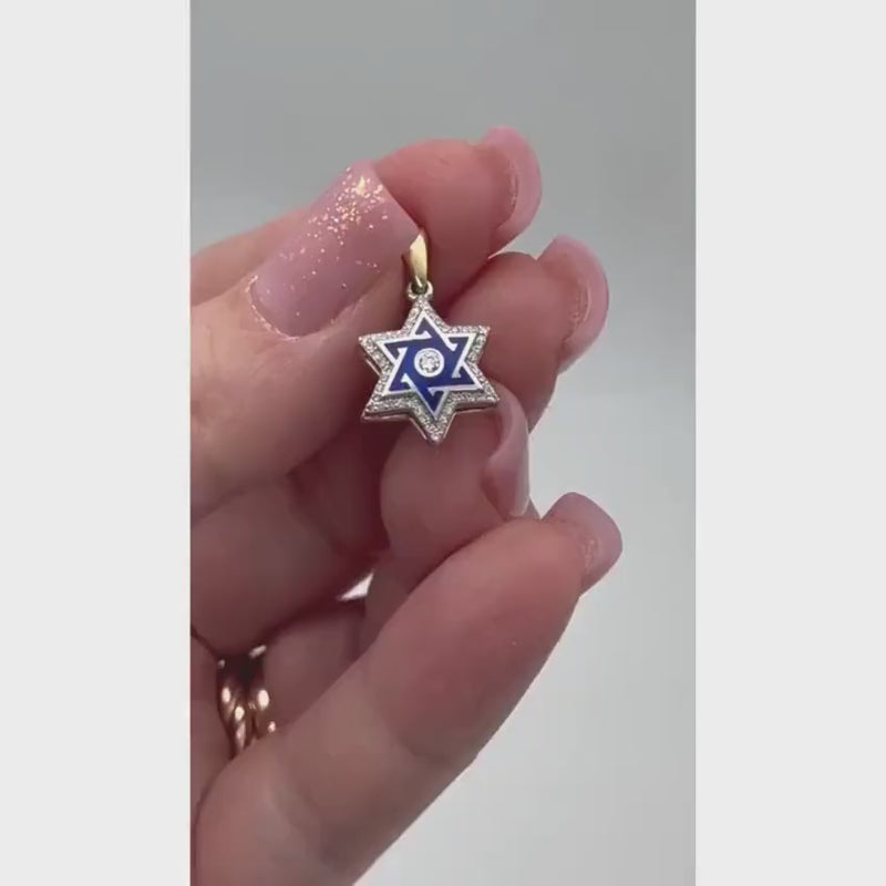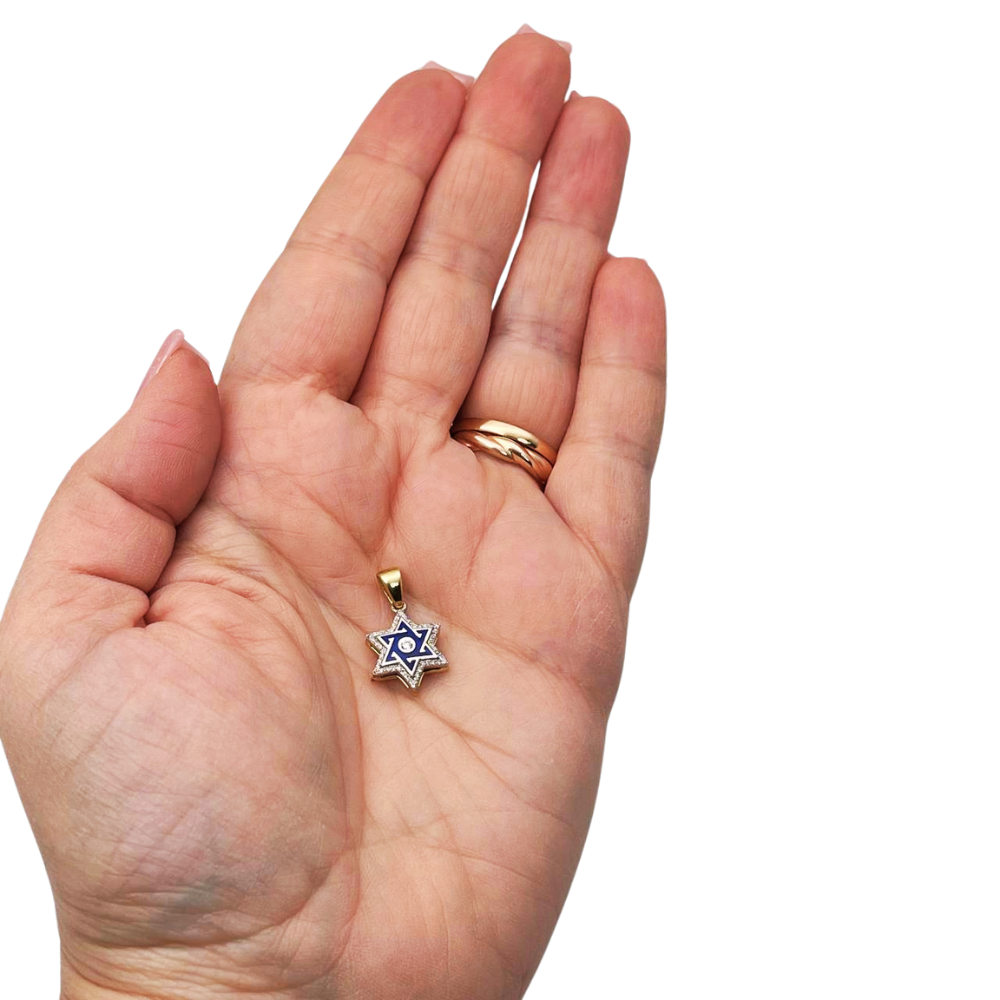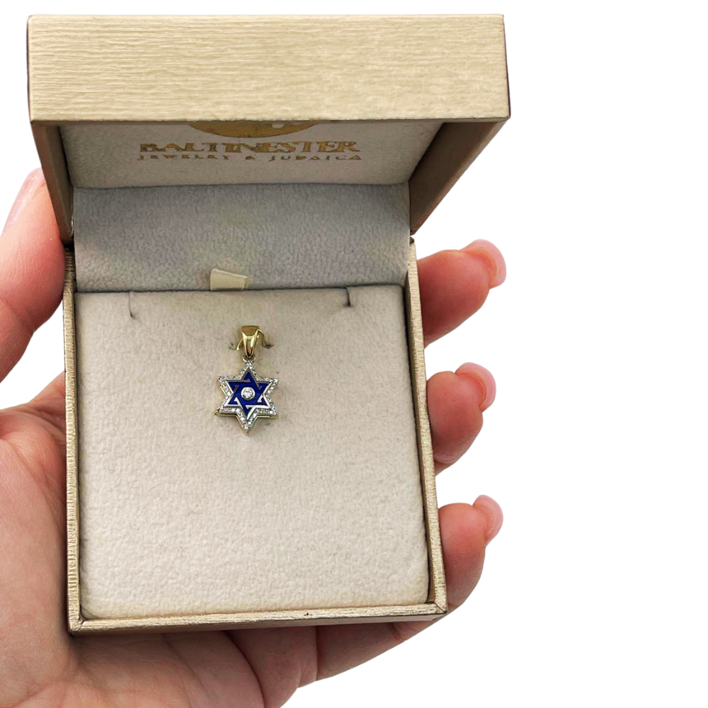 Star of David Pendant with Diamond Studded Border in 14K Yellow & White Gold with Blue Enamel