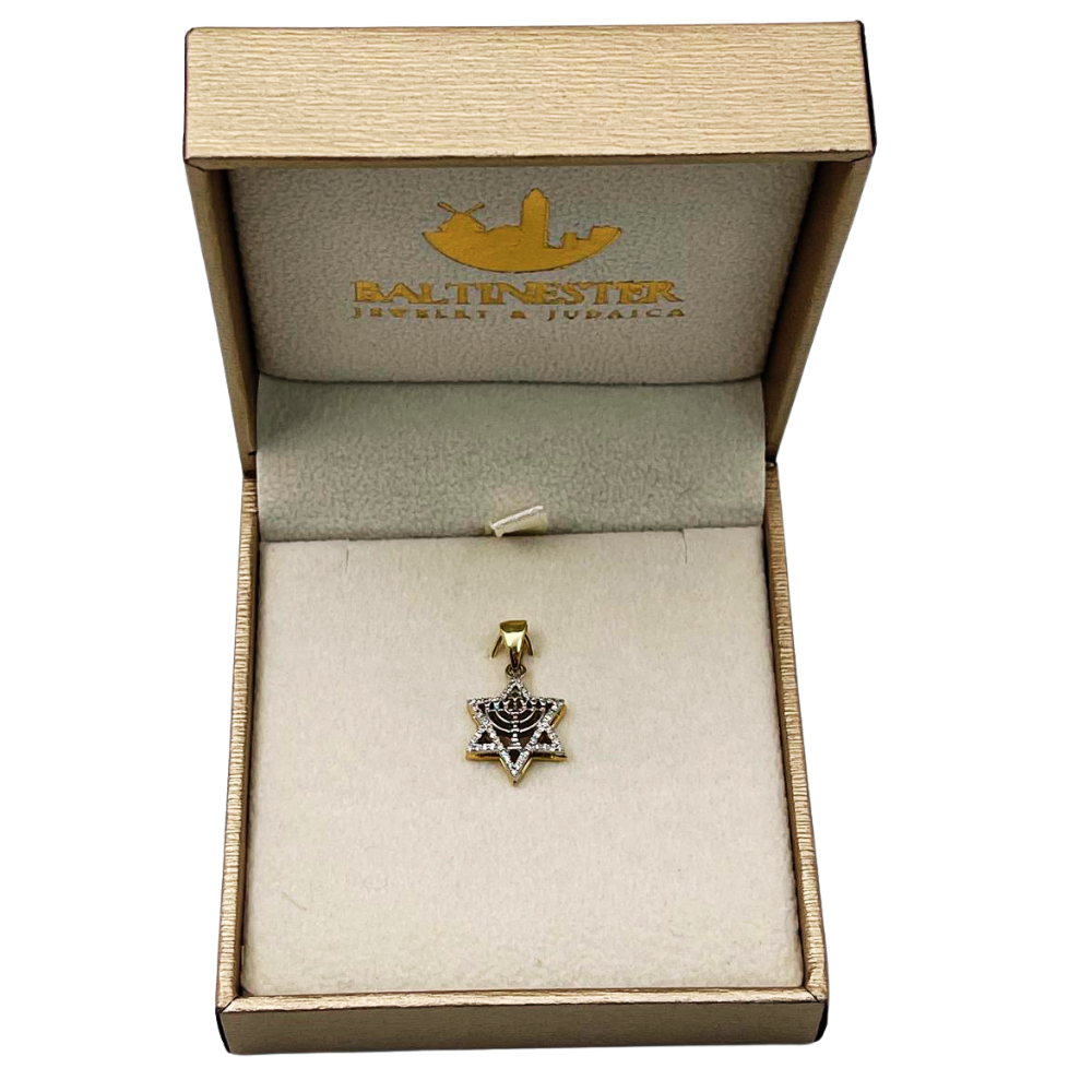 Discover the profound symbolism and exquisite craftsmanship of this 14K Gold Diamond Star of David Menorah Pendant. Handcrafted in Israel, this exceptional piece seamlessly blends tradition and artistry. The iconic Star of David, crafted in rich yellow gold, is outlined with a brilliant border of genuine diamonds, creating a captivating sparkle. At the heart of the star, a Menorah, crafted in elegant white gold, symbolizes light and spiritual illumination. This pendant is not merely an accessory; it's a powerful expression of Jewish identity, a testament to faith, and a cherished heirloom that embodies both tradition and contemporary design.