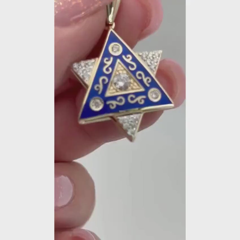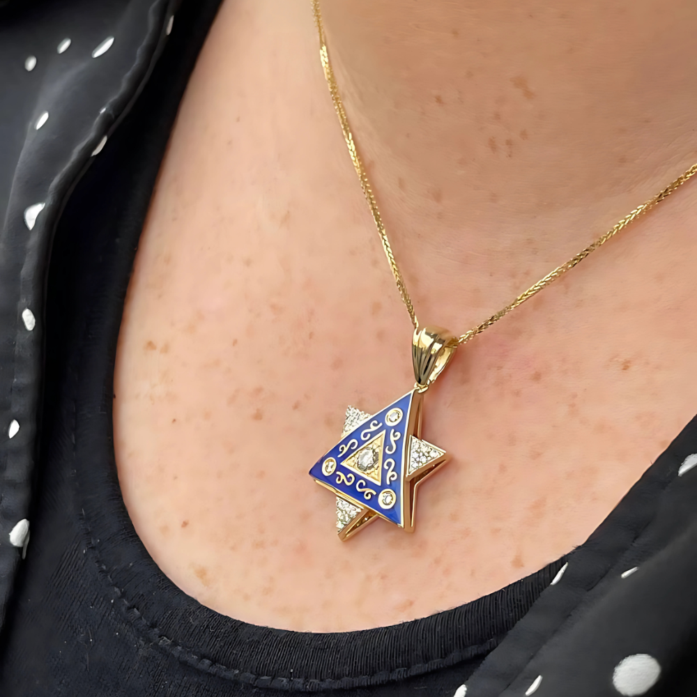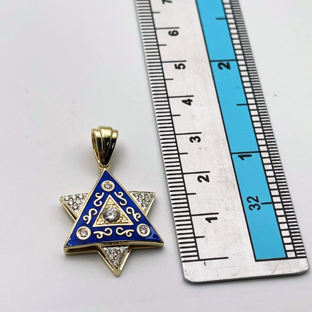 Diamond Star of David Pendant in 14K Gold with Blue Enamel and Designing - 1" Size