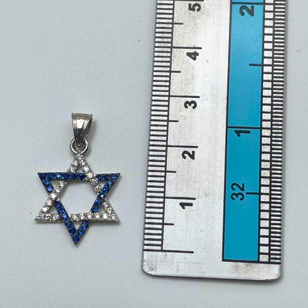 Timeless faith meets exquisite artistry in this handcrafted 14K white gold Star of David pendant, a radiant symbol of strength, identity, and divine connection. Designed with a refined interwoven structure, one triangle is adorned with brilliant-cut natural diamonds (0.24 ct), while the other glows with rich blue sapphires (0.26 ct), creating a striking contrast of light and depth.