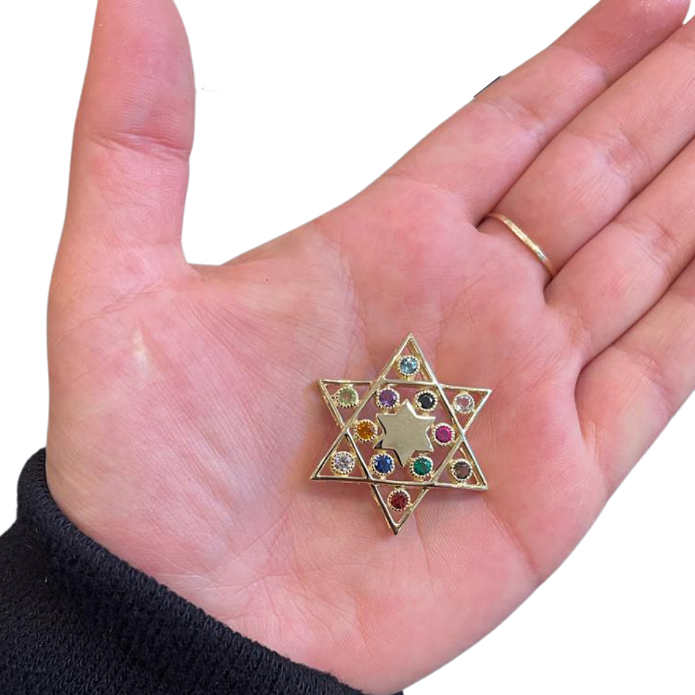 - 12 Hoshen stones: Blue topaz, Citrine, Garnet, Ruby, Onyx, Peridot, Sapphire, Topaz, Aquamarine, Amethyst, Diamond & Emerald