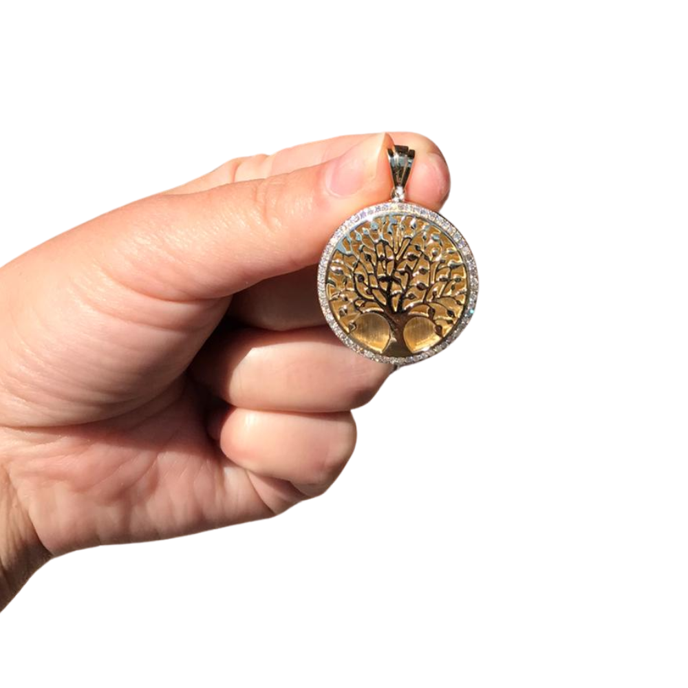 This double layer round pendant features a detailed Tree of Life with a full bounty of branches and leaves handcrafted in pure 14K gold as its top layer. A round border embedded with a row of glittering diamonds completes the look. A bottom layer of solid plain gold acts as the perfect foil. The Tree of Life is a symbolization of the knowledge of the Torah and is mentioned in The Book of Proverbs as “She is a tree of life to those who grasp her”.