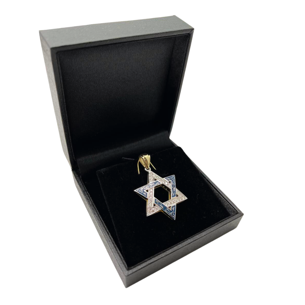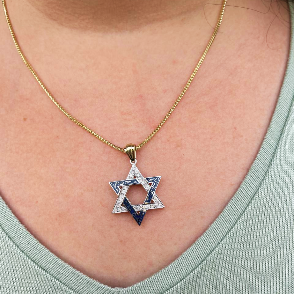 Star of David Pendant - 14K Yellow & White Gold with Blue Enamel Diamond-Studded
