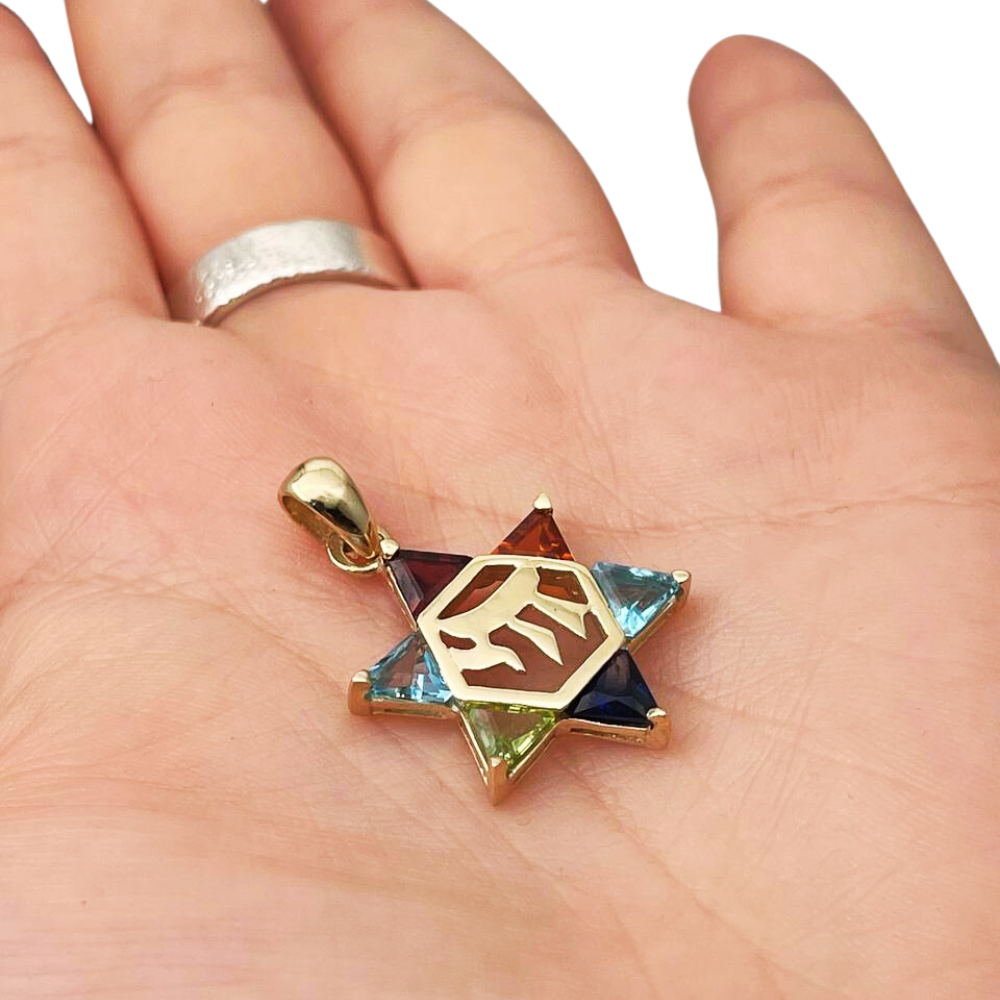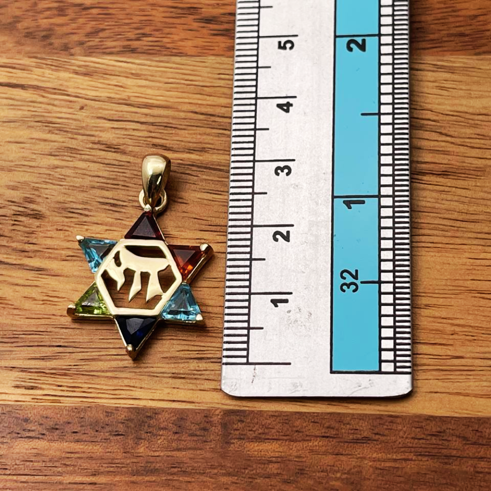 14k Gold Star of David Chai Multicolored Stone Pendant