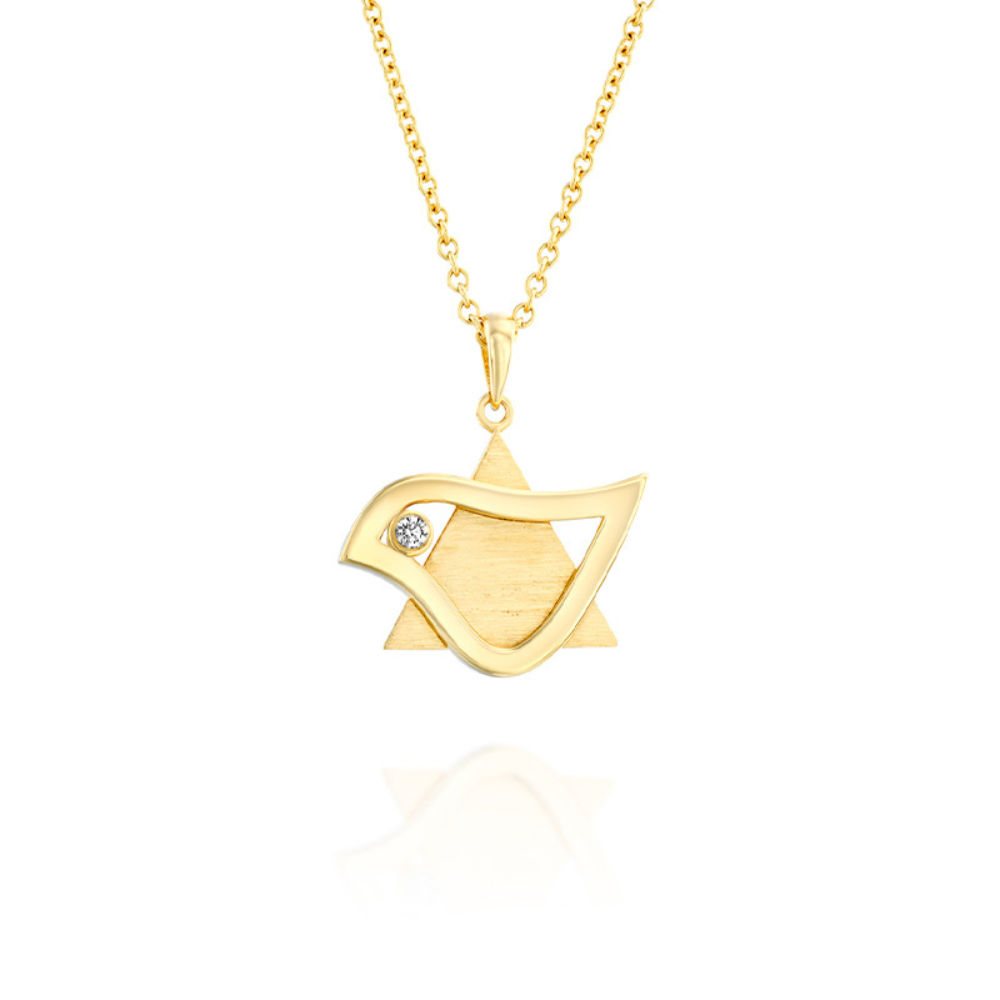 The pendant is made of a brushed yellow gold triangle and a shiny gold dove shape, representing the Dove of Peace, Israel's peace symbol. A single, glistening diamond is set as the dove's eye. The triangle and the dove come together to form the Star of David.