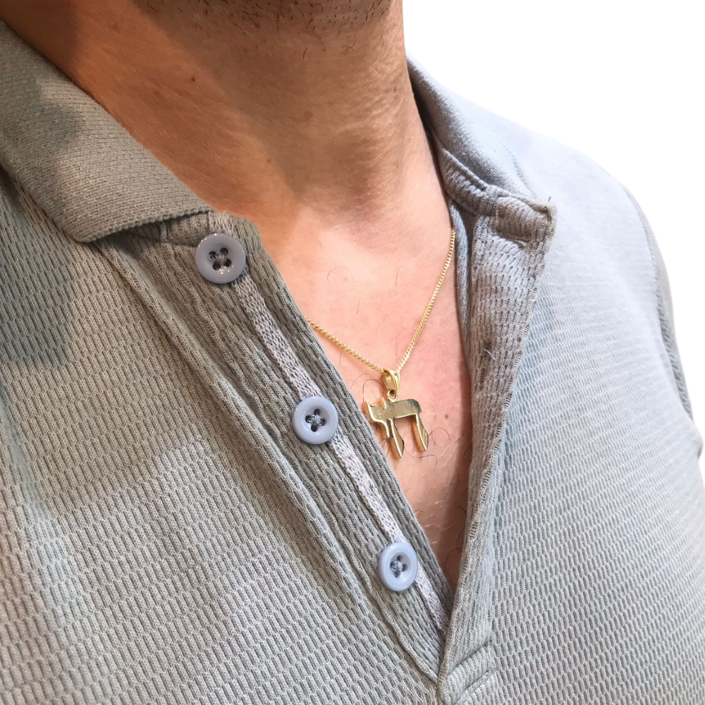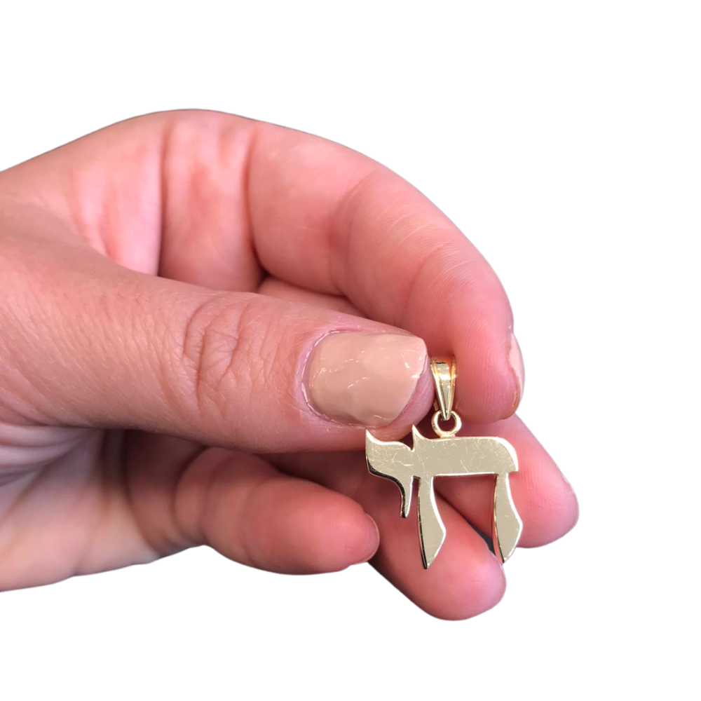 A large 14k gold Chai pendant in classic Hebrew lettering