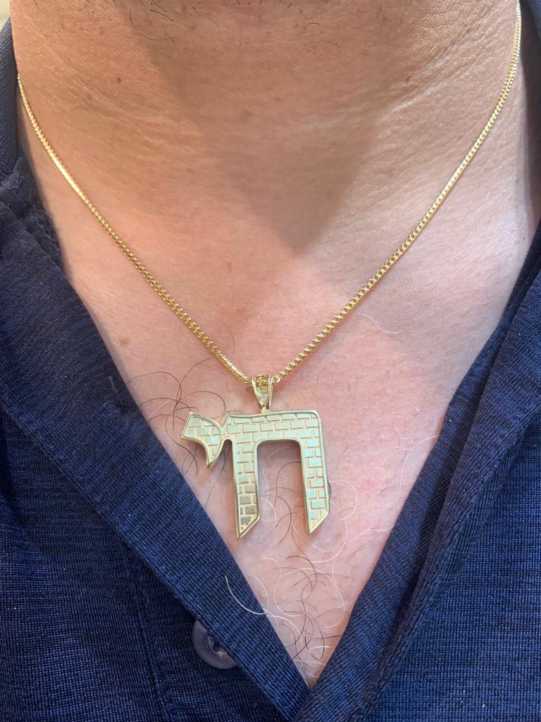 14K Yellow Gold Men's Chai Pendant with Western Wall