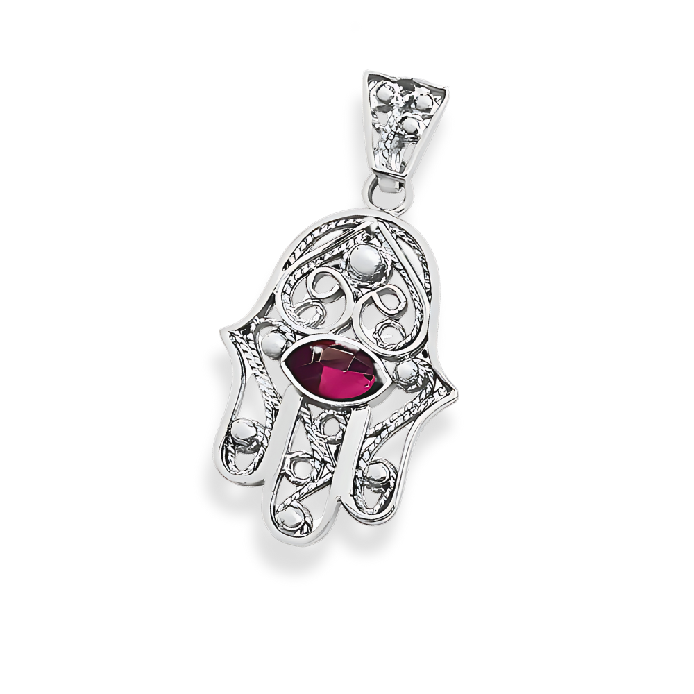 The design features a beautifully detailed Hamsa hand, an ancient symbol of protection, with a captivating garnet stone set at its center, forming an evil eye motif. The deep red garnet adds a striking contrast to the polished white gold, creating a piece that is both visually stunning and spiritually meaningful. The evil eye is believed to guard against negativity and bring peace and harmony to the wearer.
