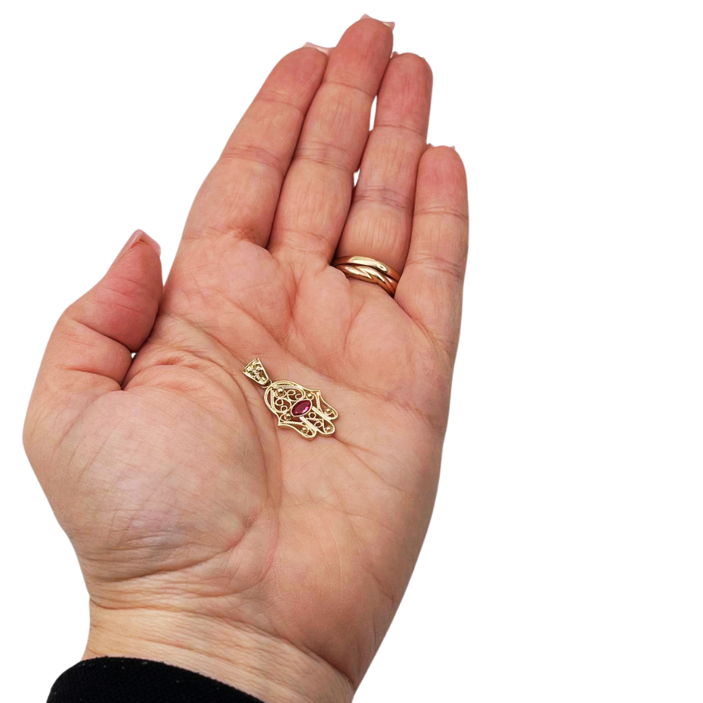 Hamsa Evil Eye 14K Gold Filigree Pendant with Garnet Stone