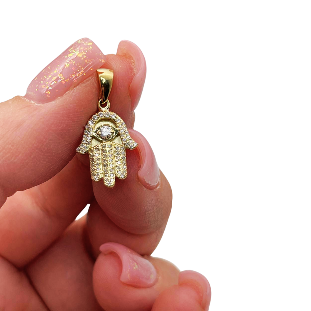 Diamond Studded Hamsa Evil Eye Pendant in 14K Gold with Large Central Diamond