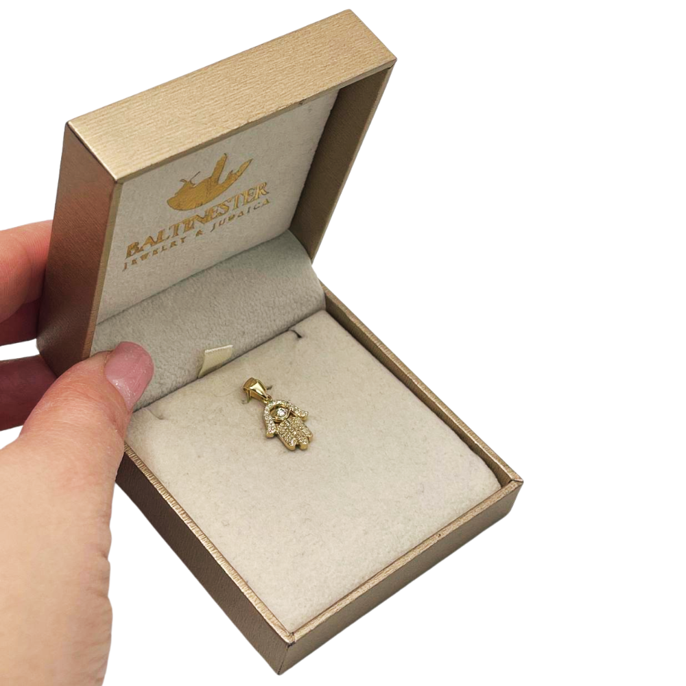 Discover the captivating blend of spiritual significance and refined elegance with this 14K Gold Diamond Studded Evil Eye Hamsa Pendant. Handcrafted in Israel, this exquisite piece is a testament to the artistry of Israeli jewelers. The iconic Hamsa hand, a symbol of protection across cultures, gracefully holds a diamond-encrusted Evil Eye, designed to ward off negativity and attract positive energy. The reverse side bears the inscription "Jerusalem," a powerful reminder of faith and connection to the Holy City. This pendant is not just an accessory; it's a cherished talisman, a symbol of protection, and a timeless piece of handcrafted art.