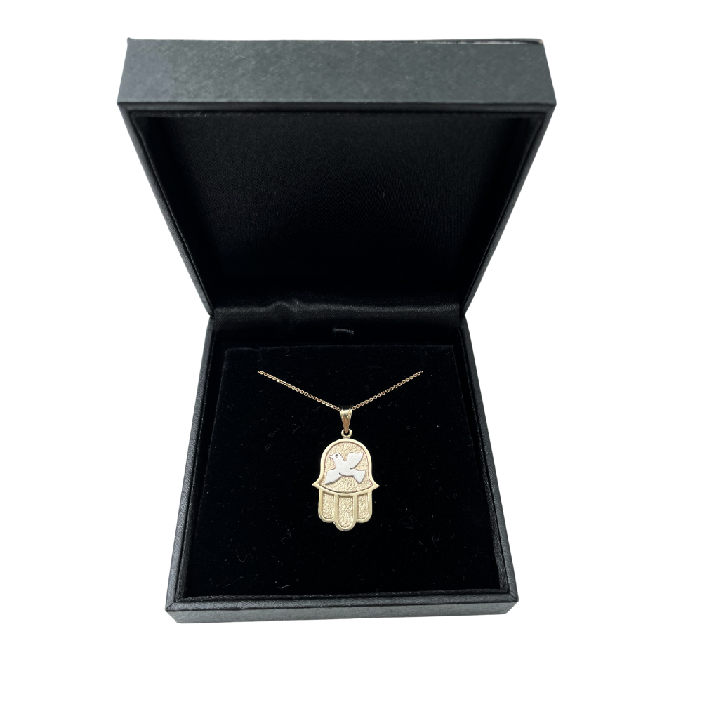 An adorable 14k yellow gold Hamsa pendant with a florentine finish and polished borders. A solid white gold dove is soldered on in the center.
