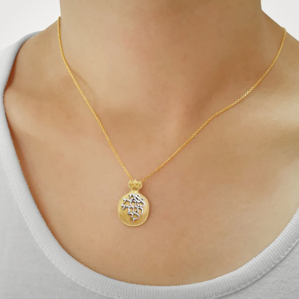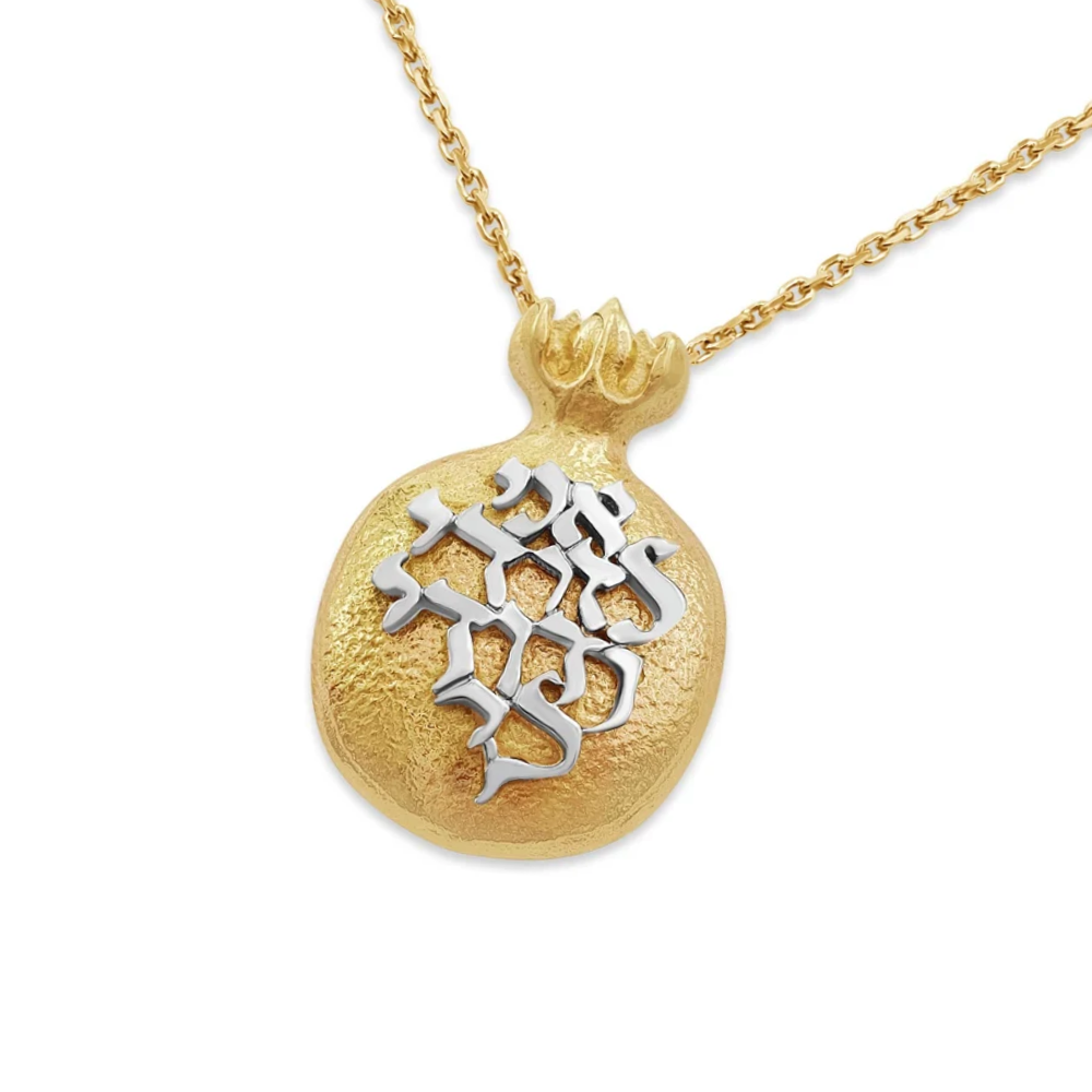 A stunning pendant handcrafted in 14K gold in a brushed finish, this represents the pomegranate, a fruit considered to be one of Israel's special seven species. Incorporated on the fruit is the phrase "Ani L'dodi V'dodi Li" in the Hebrew script (which translates to - I am my beloveds and my beloved is mine).
