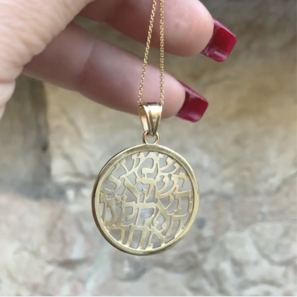 Large, round gold pendant with a matte finish. The words of Shema Israel are cut out, filling the entire center.
