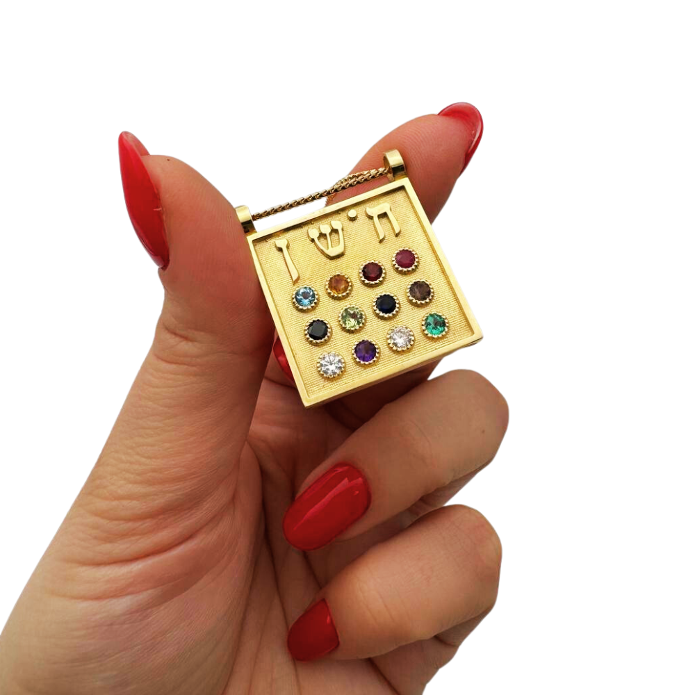 This necklace (pendant and chain come together) is a very close replica of the choshen, or breastplate, that the high priests wore during the times of the Holy Temple. The 12 stones are all precious and semi precious stones as depicted in the Bible, representing the 12 Tribes of Israel.