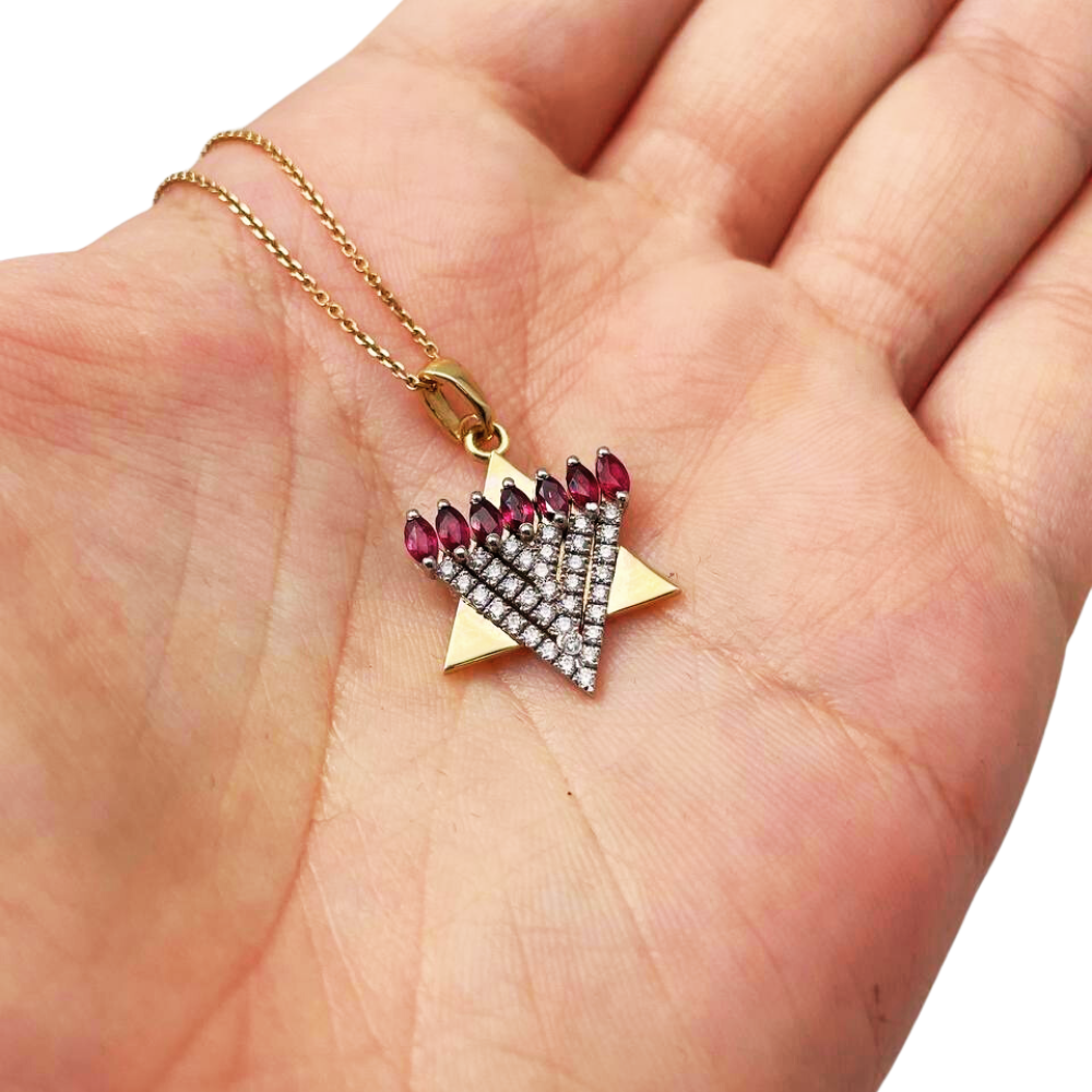 Menorah Pendant with Diamonds and Rubies in 14k Gold