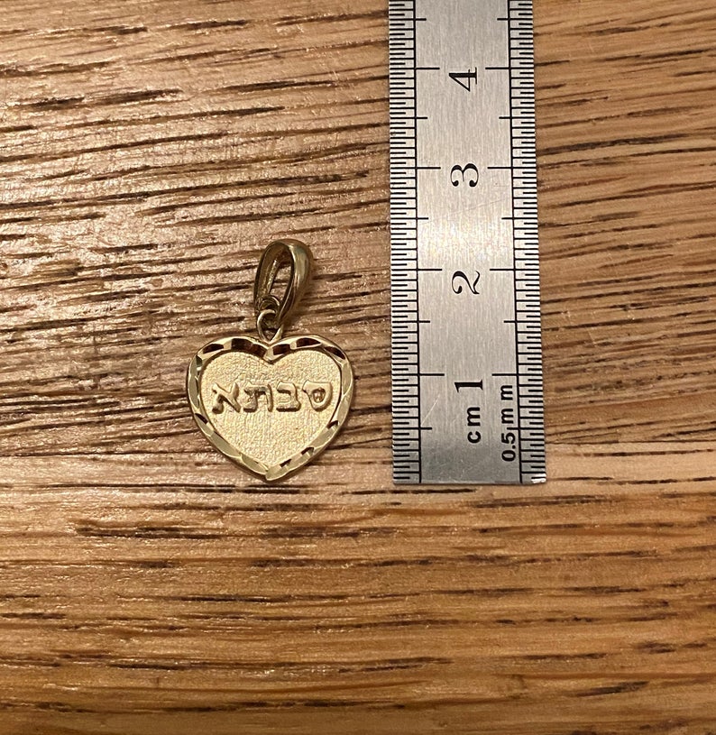 Express your love and appreciation for your Grandma with this heart shaped pendant. The shape is the symbolic heart of gold of a grandmother. Inscribed in Hebrew inside the heart on a lightly textured background is the one word that spells a loving emotion – Grandma. The heart shaped pendant is bordered with a diamond cut finish.